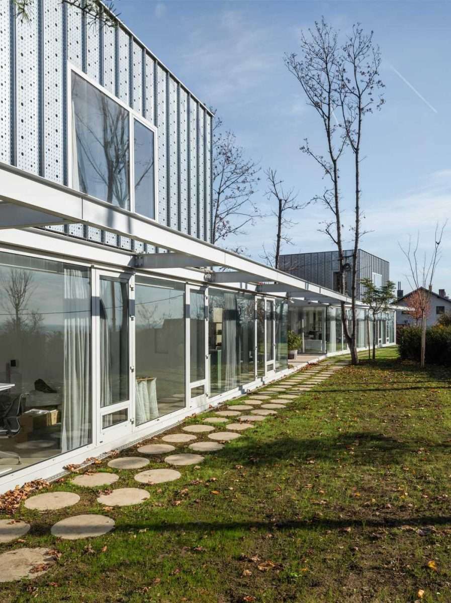 S ulične strane stambeni dijelovi kuća izgledaju kao da su smješteni na zelenom nasipu u kojem se nalaze garaže i servisni prostori. Konzolne betonske stube vode do ulaza koji se nalaze u razini iznad ulice. Izduženi objekti povezani su otvorenom terasom koja na specifičan način stvara situaciju atrijskih kuća, a ujedno predstavlja točku potencijalnog povezivanja dviju susjednih obitelji. Na svakoj od lamela nalazi se još manji volumen sa spavaćom sobom, zapravo samo prostorijom smještenom u prizemlju, čime se konačno definira „novi“ tip linearne prizemne atrijske kuće u nizu, koja se dužom stranom otvara prema van (standardne atrijske kuće obično se dodiruju dužim stranicama, a kontakt s eksterijerom imaju preko užih stranica).