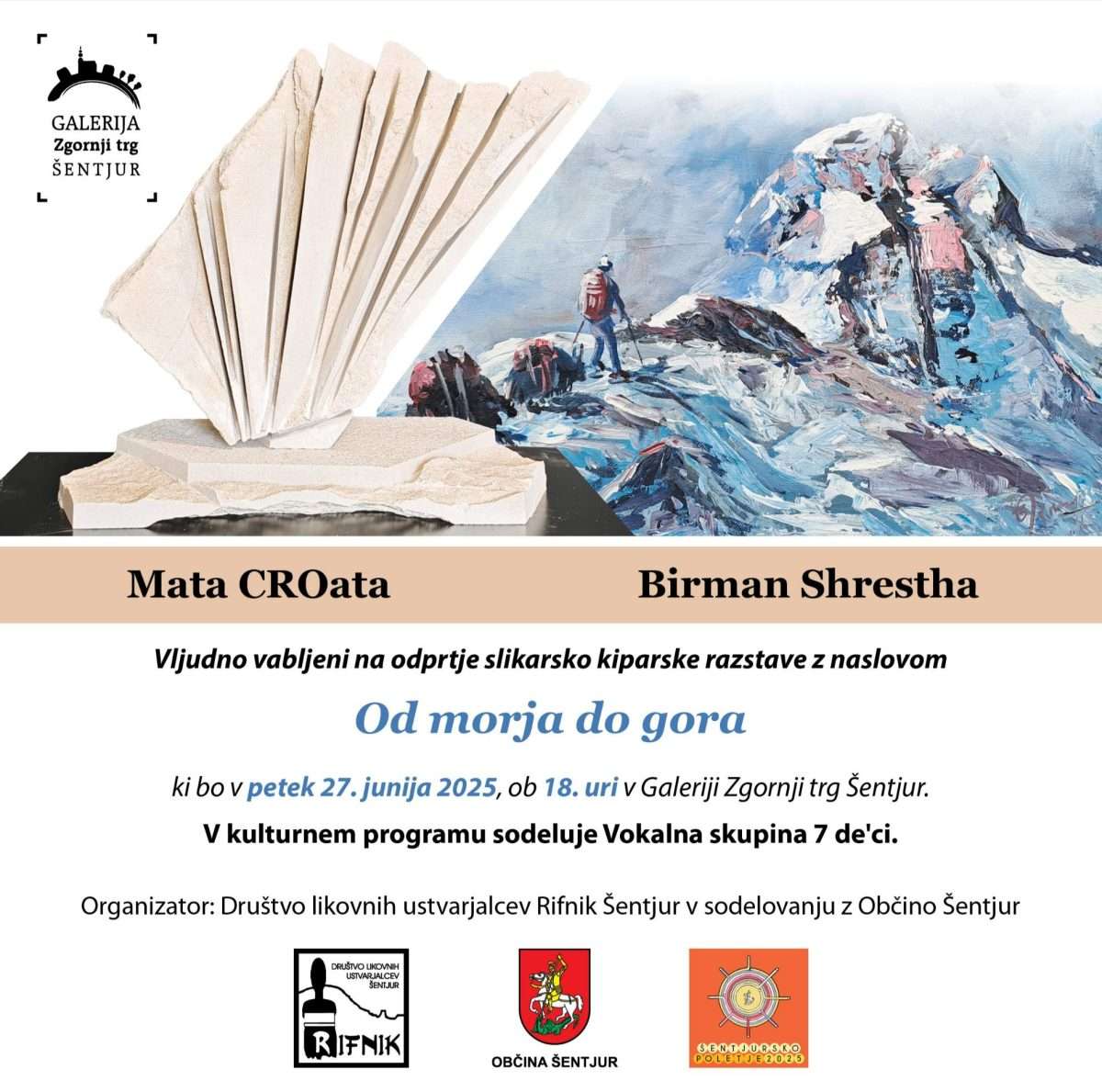 Pozivamo vas na otvorenje izložbe slika i skulptura Mate CROate i Birmana Shresthae pod nazivom Od morja do gora, koje će se održati u petak, 27. lipnja 2025. godine, u 18 sati u Galeriji Zgornji trg Šentjur (Slovenija)
