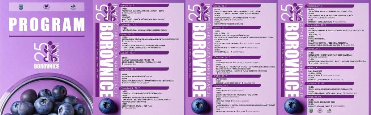 Plav, 16. jula 2025. godine, svečano su otvoreni jubilarni 25. Dani borovnice, kao dostojanstvena proslava četvrt vijeka kulturnog i društvenog sazrijevanja. Manifestacija koja je kroz godine prerasla lokalni okvir, okupljajući Plavljane, Gusinjane, dijasporu i goste iz svih krajeva Crne Gore i regiona, postala je istinski festival zavičaja spoj netaknute prirode i snažnog identiteta, nasljeđa predaka i duha savremenog vremena.