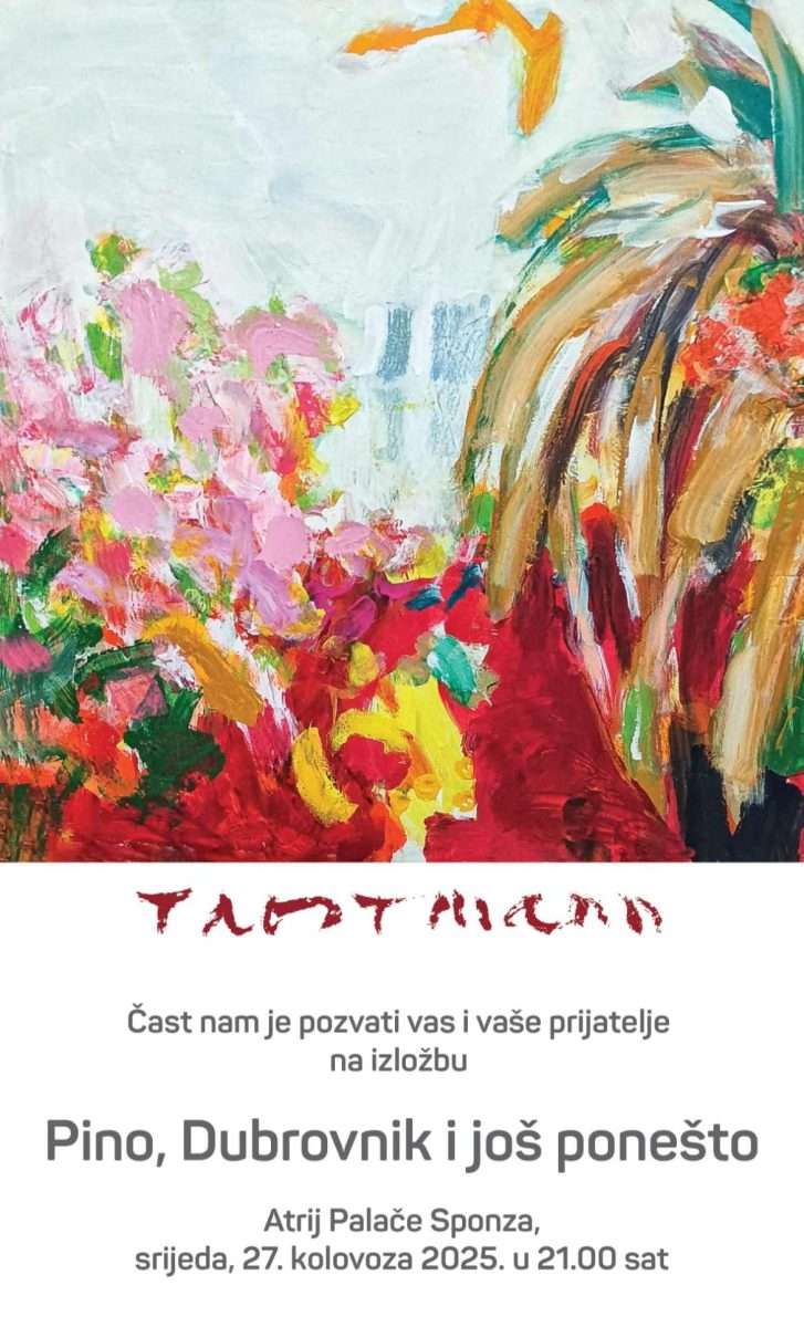 U srijedu, 27. kolovoza 2025. u 21 sat otvara se u Atriju Palače Sponza samostalna izložba jednog iz malobrojne skupine najuglednijih suvremenih hrvatskih likovnih umjetnika akademskog slikara Josipa Trostmanna Pino, Dubrovnik i još ponešto, autora kompleksnog opusa