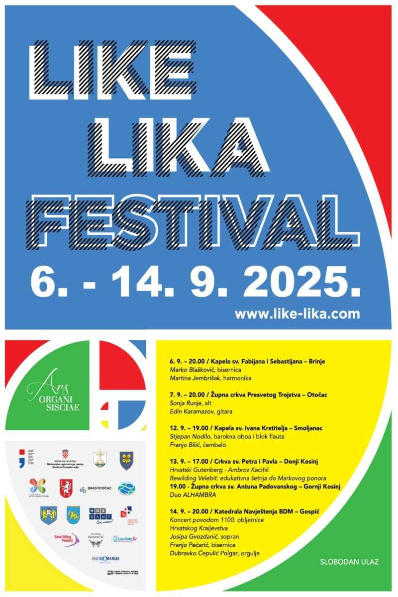 Peto izdanje Like Lika Festivala održat će se od 6. do 14. rujna 2025. u Brinju, Otočcu, Smoljancu, Gornjem Kosinju i Gospiću. Festival i ove godine donosi jedinstvenu priliku da otkrijete čari kulturne i prirodne baštine Like, da doživite njezinu povijest tragovima prvog hrvatskog tiskara Ambroza Kacitića, da zakoračite u netaknutu prirodu tijekom vođene šetnje do ponora rijeke Like – a sve to uz vrhunsku glazbu koja u Lici posebno svečano odjekuje.