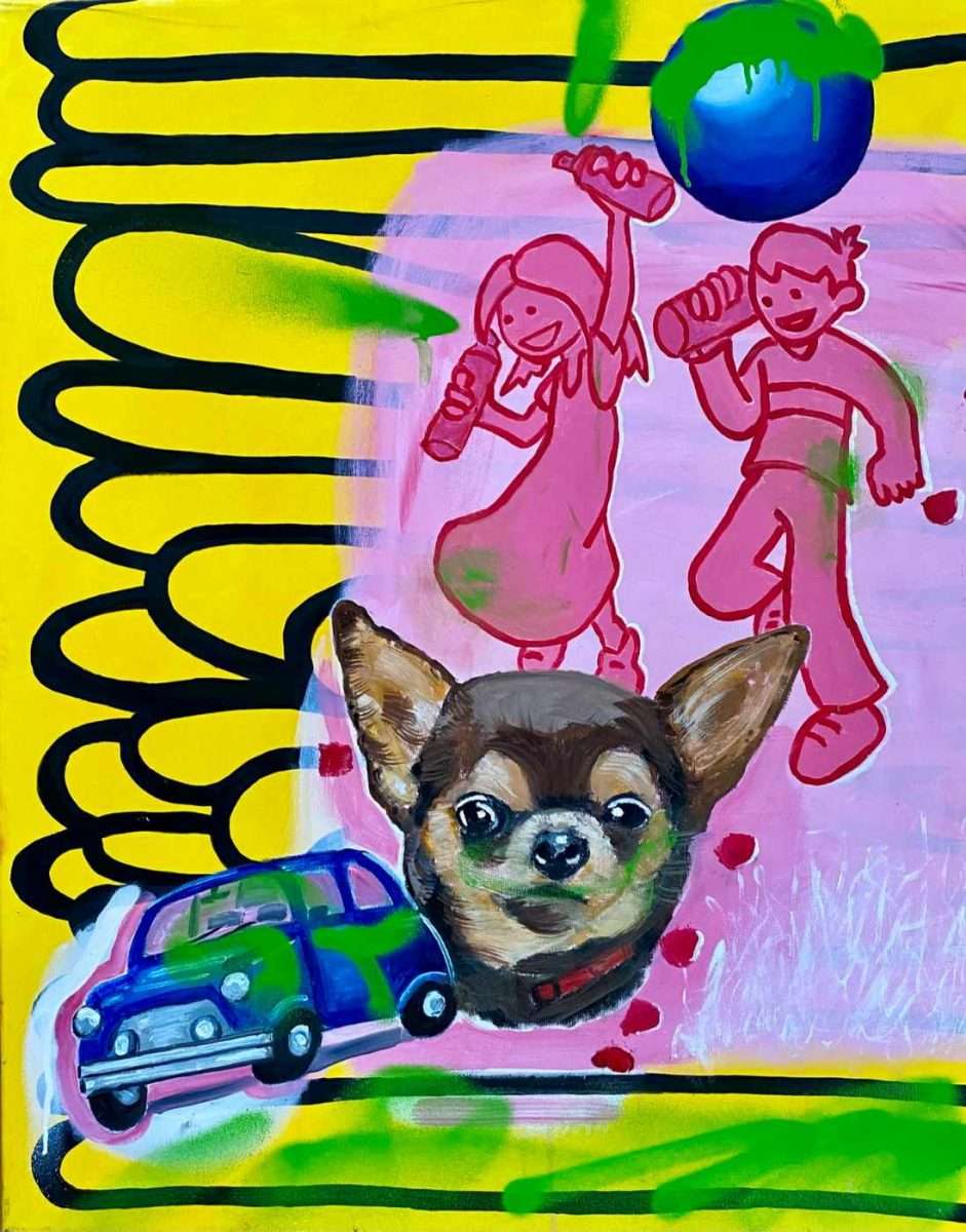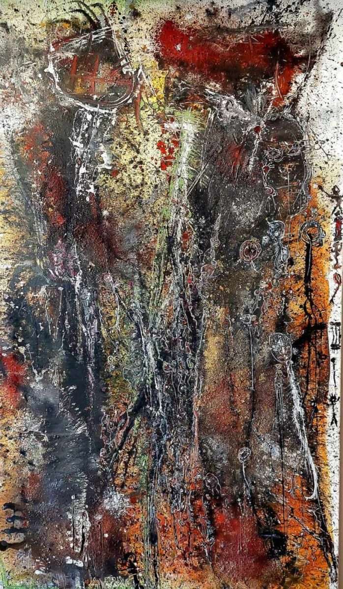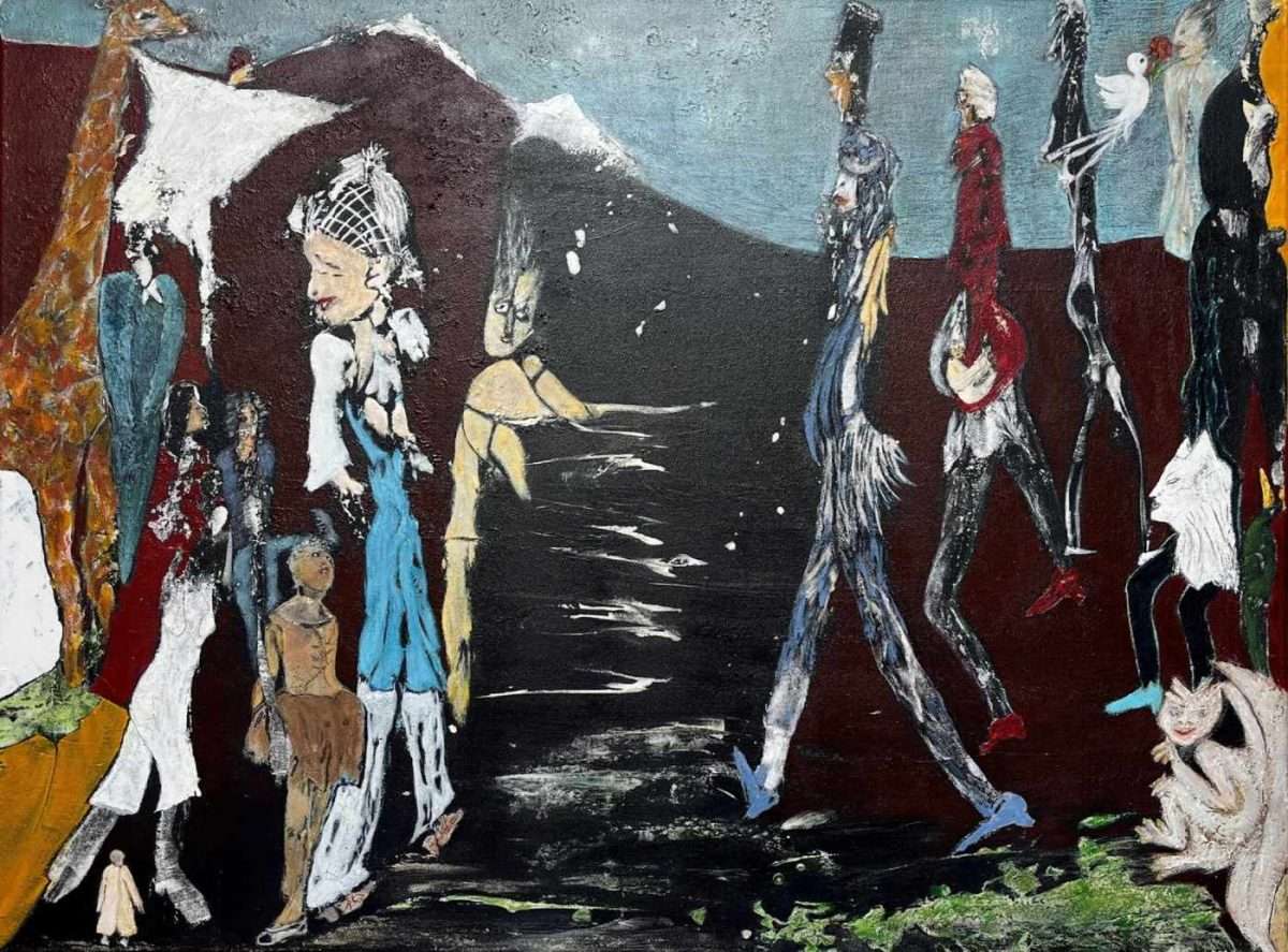 Christa Bock-Köhler realisiert mit kombinierter Technik auf Leinwand im mittleren Format ein Werk, das sie „Auch die Giraffe schaut zu!“ nennt. Auf dem Bild finden wir tatsächlich eine Giraffe, aber auch eine Vielzahl unterschiedlicher, nicht gerade freundlicher Gestalten. Wie aus der Fantasie oder einem bösen Traum taucht eine Sammlung karikaturartig dargestellter Kreaturen auf. Dem Betrachter bleibt es überlassen, die Figuren zu erkennen. Es gibt langgezogene Personen, Masken, eine Figur, die ein Kind trägt, möglicherweise übertrieben modische Gestalten, ein katzenartiges Wesen, eine Tänzerin und sogar die Idee eines weißen Wesens mit Assoziationen zum Teufel über einem grünen Bereich, der vielleicht ein Teich oder Sumpf ist. Die Landschaft im Hintergrund scheint durch einen gelben Anzug vertikal in zwei Gruppen geteilt zu sein. Es ist unklar, ob es sich um zwei Kontinente, Land und Wasser oder eine Anspielung auf die Energie eines Gebiets handelt. Die Figur in weißer Kleidung scheint zu versuchen, den Blick der Giraffe von dieser seltsamen Gruppe abzuwenden. Es wirkt, als wolle die Künstlerin ausdrücken, dass die Zivilisation auf gewisse Weise entgleist ist und die natürliche Ordnung stört.