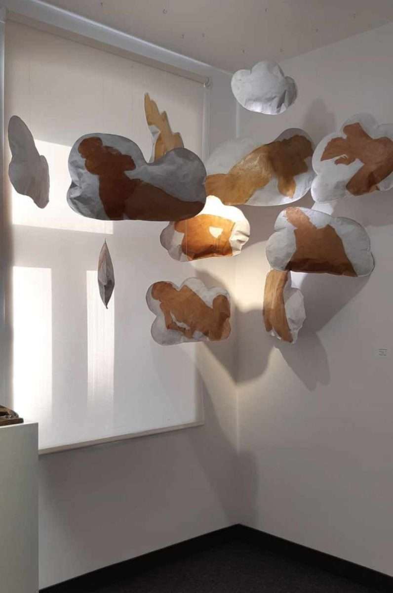 Siglinde Berndt realisiert papierene Formen, die mit kombinierten Techniken bearbeitet wurden und an Wolken erinnern. Obwohl die Künstlerin die Installation „Wolken“ nennt, können wir auch Assoziationen zu Kissen für Komfort oder mögliche erotische Anspielungen herstellen. Der Untergrund bleibt weiß. Darauf erkennen wir Körperformen, die wie Aktdarstellungen wirken. Die flüchtige Gestaltung von Körpern oder Körperteilen verschmilzt mit der papierenen Unterlage, die als dreidimensionales Objekt ausgeführt ist. Jedes dieser Objekte ist im Raum aufgehängt und wird dem Betrachter so präsentiert. Es hängt von seinem Mut oder seiner Neigung ab, ob er sich die Mühe macht, genauer hinzusehen oder vielleicht sogar einen sanften physischen Kontakt herstellt.