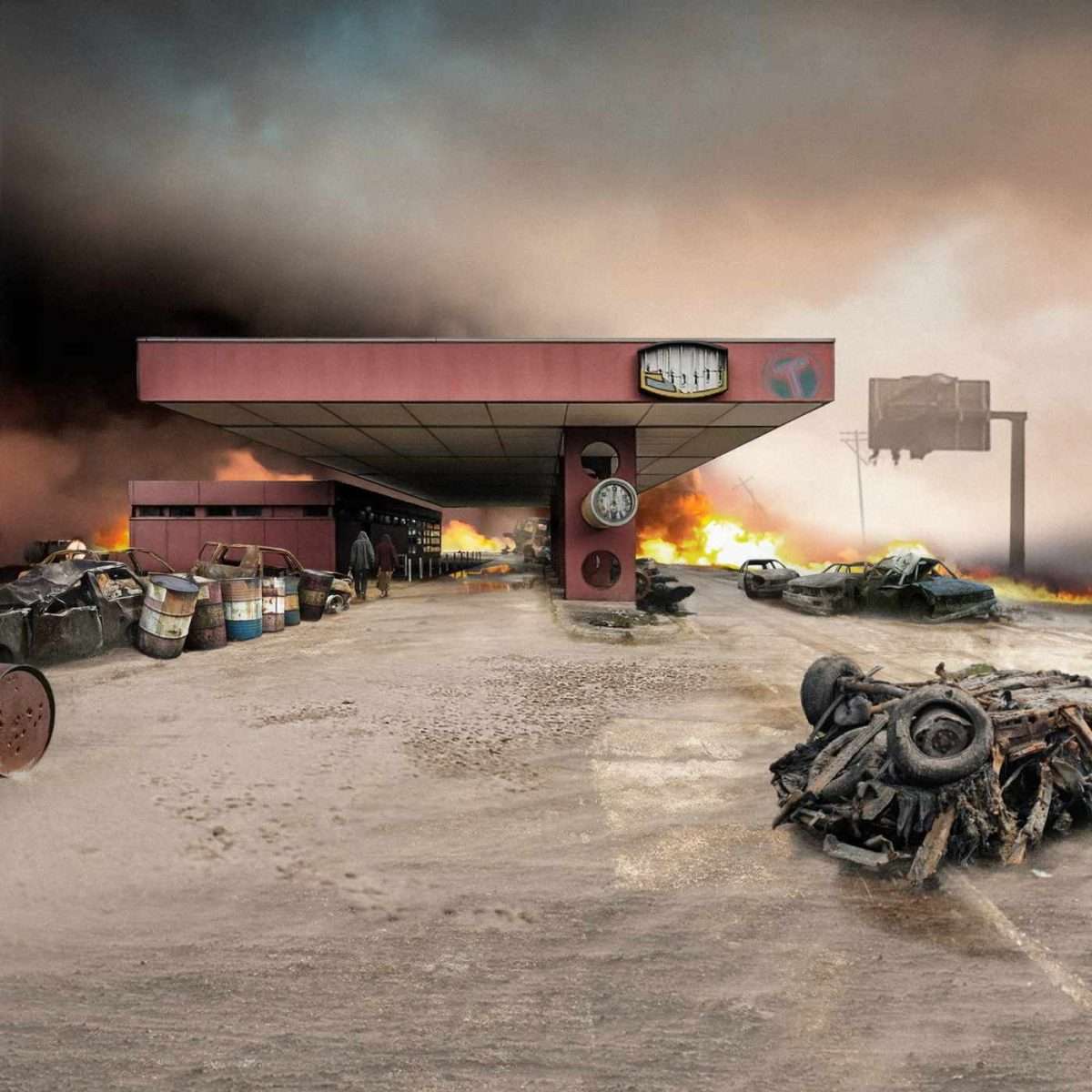 Christoph Göpner präsentiert eine digitale Collage mit dem Titel „Ost-West“. Das Werk zeigt eine apokalyptische Situation: eine zerstörte Tankstelle, Brände, ausgebrannte Fahrzeuge. Leider ist dies keine Fiktion, sondern Realität in einigen Teilen der Welt. Zwei Personen scheinen die Umgebung nicht zu bemerken und gehen, wie früher, in Richtung des Tankstellenmarkts. Als hätten sie die Uhr nicht gesehen, auf der die Zeit stehen geblieben ist… Dieses Werk warnt vor den unmenschlichen Handlungen der Mächtigen, von direktem Töten über die Zerstörung von Ressourcen bis hin zum Aushungern von Menschen. Die Hysterie der Konsumgesellschaft, die Unfähigkeit, das Angebot zu absorbieren und ähnliche Situationen, die der Kapitalismus als demokratischen Liberalismus ausgibt, werden hier künstlerisch hinterfragt. Wir selbst sind Zeugen der Raserei von Interessen, religiösen Überzeugungen und der Abschottung in immer kleinere, isolierte Staaten.