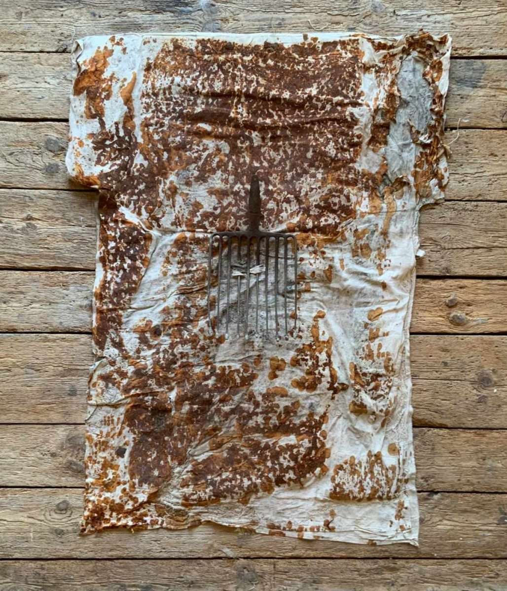 Silvia Hatzl präsentiert zwei flache, reliefartige Installationen, die durch eine ungewöhnliche Kombination von Materialien und Techniken entstanden sind: Leinen, Holz, Pigmente, Leder, Rost… Die Werke erinnern an einfache Kleidungsstücke in T-Form, wie T-Shirts oder idyllische Kleider. Doch sie zeigen reiche Spuren spontaner und beabsichtigter Veränderungen – von Farben, Flecken, Löchern, Knitterfalten, Rost… Diese beiden Arbeiten bilden eigentlich ein Diptychon, in dem ein beginnender Verfallsprozess angedeutet wird – noch getragen von einer Idee positiver Emotion – eines der Werke zeigt ein dramatisches Finale. In diesem Werk führt die Künstlerin einen gefährlichen, scharfen Gegenstand ein, der an eine Harpune oder Mistgabel erinnert, und platziert ihn ins Zentrum der Komposition. Die Dramatik dieser Szenen scheint mahnen zu wollen – sie macht auf den persönlichen wie auch allgemeinen Verfall zwischenmenschlicher Beziehungen in der heutigen Gesellschaft aufmerksam. Teilweise hat bereits die Bewegung Arte Povera in der zweiten Hälfte des letzten Jahrhunderts auf diese Probleme hingewiesen, indem sie nicht-künstlerische Materialien verwendete. Diese Bewegung beruhte auf der Idee, dass Künstler gegen die aufgezwungenen Werte der Institutionen, gegen die industrielle Werbemaschinerie und erstarrte kulturelle Normen protestieren. Eines ihrer Konzepte war es, gelenkte Kunstsysteme zu umgehen und die Vorstellung zu etablieren, dass Kunst (alles und jeder) Leben ist. Die Verwendung von marginalisierten, weggeworfenen und/oder zerstörten Materialien sowie deren Wiederverwendung – die sogenannte Re-Use-Methode – macht uns auf die emotionale Verwahrlosung unseres Bewusstseins aufmerksam. Sie bietet die Idee, dass es – trotz der Gier des Kapitals – Bemühungen gibt, rechtzeitig die Absichten der Profiteure zu durchschauen, die nicht davor zurückschrecken, alles zu zerstören, was die Idee von Zusammenleben, Respekt für fremde Identitäten und eine faire Aufteilung von Gewinnen verkörpert – statt dass der Großteil der Einnahmen an die Fabrikbesitzer geht und die tatsächlichen Produzenten hungrig und entrechtet zurückbleiben. Die Künstlerin ist Zeugin und bietet Warnungen an. Sie stellt auf dramatische Weise eine Auseinandersetzung mit dem Begriff der Empathie zur Diskussion.