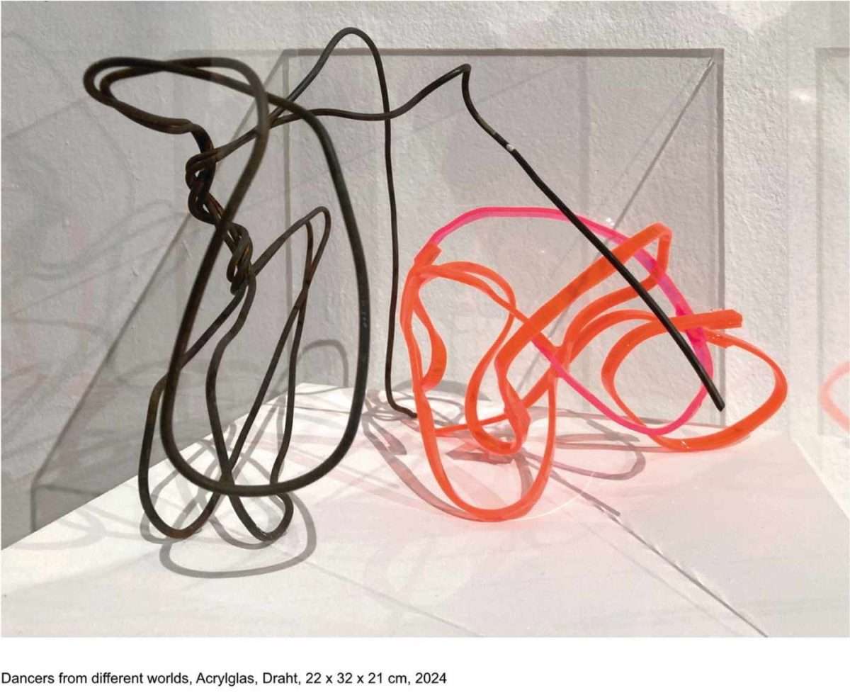 Cornelia Hesse jednostavnim načinima i sredstvima oblikuje dva prostorna rada. Jednog naziva „Plesači iz različitih svjetova“, a izvodi ga od žice i akrilnog stakla. U malom, transparentnom prostoru ona savijanjem formira žice različitih boja: crne i crvene. Od crvene kao da oblikuje žrtvu dok crna djeluje agresivno i kao da napada crvenu žičanu konstrukciju. Iako u naslovu nalazimo pojam plesači, oblici savijanja i kolori asociraju na grublje radnje. Dramatika je postignuta oblikovanjem i bojama materijala.