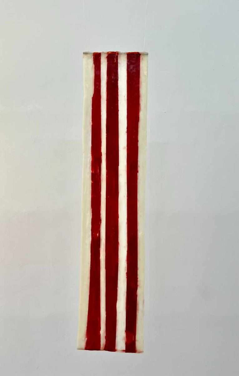 Utta Kasparek bietet ein einfaches Werk, das wir persönlich erleben und interpretieren müssen, besonders da die Künstlerin es „Ohne Titel“ nennt. Die Idee des ständigen Flusses und der Veränderlichkeit von allem sowie die Tatsache eines künstlerischen Artefakts verorten die Wahrnehmung des Werks im Bereich der Evokation von Energien. Die Künstlerin spielt mit Formen und Farben. Der Sinn dieses Werks könnte in den Beziehungen der Farben und dem künstlerischen Verfahren gesucht werden, in vertikalen roten Linien auf gelblichem Untergrund. Die Ausdruckstechnik, Wachs und Pigment, führt uns zu ökologischen Aspekten der Zivilisation. Fast geometrische, aber dennoch unregelmäßige, spontane Formen suggerieren die Idee eines fraktalen Seins der Dinge um uns herum. Die Künstlerin erinnert uns daran, dass Verstehen und Erkennen immer vorläufige Prozesse sind, die ständige Reflexion erfordern und kein Ende haben.