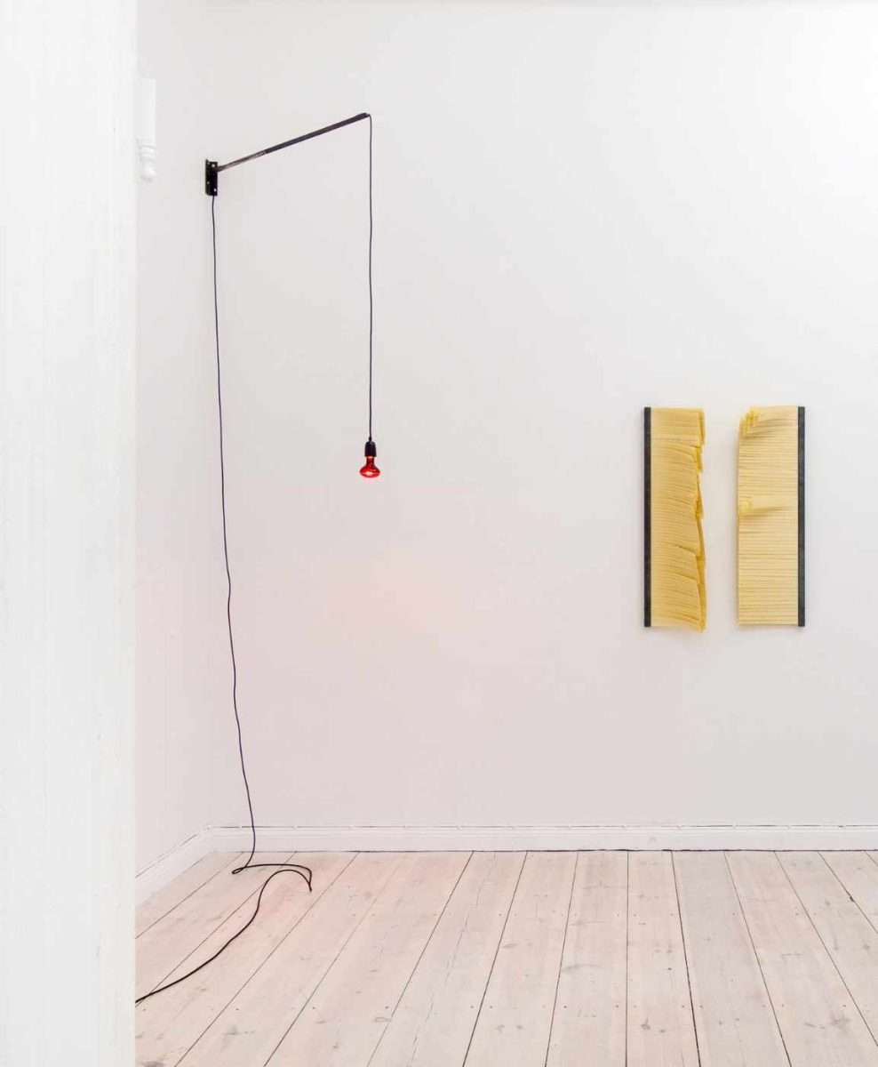 Laura Killer präsentiert eine interessante Installation mit dem Titel „Ich sehe Wärme“. Das Werk besteht aus einem Stromkabel, einer Konstruktion/Halterung und einer roten Heizlampe. Daneben sind an der Wand zwei vertikale Segmente des Werks „In der Sprache“ angebracht. Diese sind wie ein Buch gestaltet, jedoch mit linearen Zeichnungen, die wie dünne, streifenartige Seiten wirken, auf denen wir Aufzeichnungen erkennen. Diese „Bücher“ sind spiegelbildlich angeordnet, sodass wir annehmen können, dass die Aufzeichnungen, ob von links nach rechts oder von rechts nach links, in dieser Zivilisation legitim sind. Einige Schriftsysteme, z. B. Arabisch, Hebräisch, Urdu, Persisch, Kurdisch und Jiddisch, verlaufen von rechts nach links. Unabhängig davon, wie die Aufzeichnungen genau geschrieben sind, kann diese Idee die Achtung aller Formen schriftlicher Gedanken verdeutlichen. Die Idee, die Realität zu hinterfragen, zeigt sich auch in der Wahl der Materialien, die alle natürlich sind: Holz, Papier, Metall und insbesondere Bienenwachs.