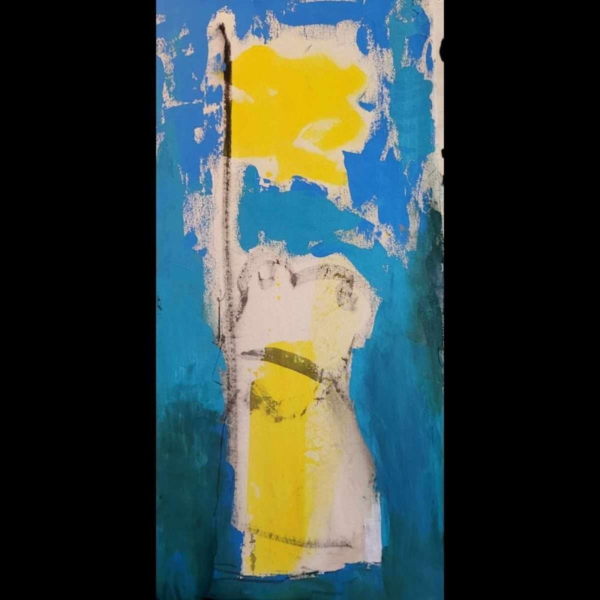 Beatrix Koberger zeigt ein Werk mit dem Titel „Slava Ukraini“. Hier werden die Farben der ukrainischen Flagge, Blau und Gelb, verwendet. Unabhängig von unserer persönlichen politischen Haltung zu diesem Krieg unterstützen Künstler in der Regel keine Gewalt. Doch nur wenige recherchieren verschiedene historische Quellen, um auf Basis von Vergleichen, Fakten und Tatsachen eine eigene Meinung zu bilden. Denn wir haben erkannt, dass es verschiedene Arten und Zugänge zur Geschichte gibt, sodass in der Literatur oft interessengeleitete, religiöse, politisch genehme oder andere bevorzugte Ansichten zu finden sind. Dieses Spiel mit Formen und Farben, ausgeführt in Acryl auf Leinwand, ist dennoch abstrakt und erst der Titel des Werks definiert die Idee der Künstlerin.