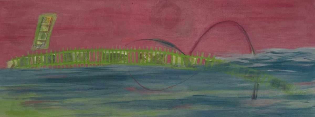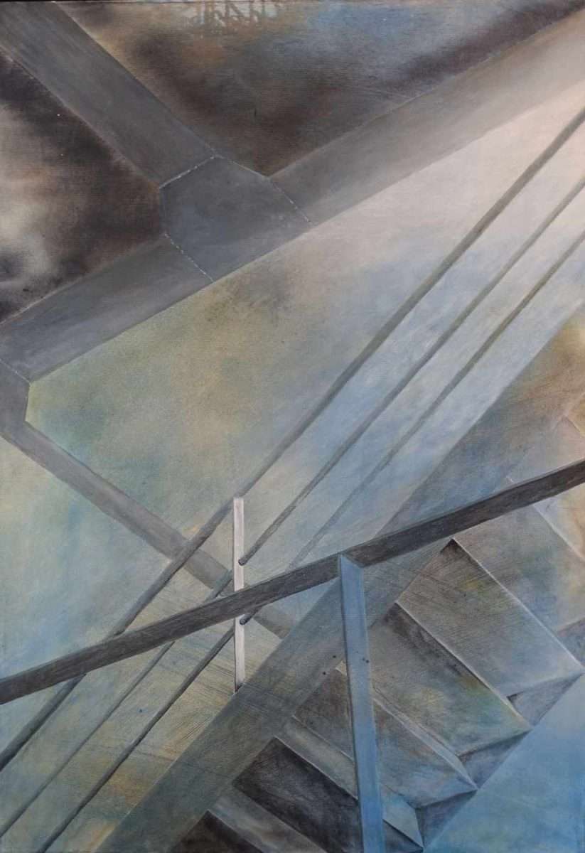 Angelika Sobeck-Kistner präsentiert zwei Werke. Eines nennt sie „Fähre“, das andere „Obwohl es sehr eng ist“. Auf dem ersten, ausgeführt in Acryl auf Leinwand, finden wir ein Detail eines Treppenhauses und der Konstruktion der Fähre für den Transport von Fahrzeugen und Menschen. Die kühlen Linien und Flächen der Metallkonstruktion sowie deren Beziehungen ziehen die Aufmerksamkeit der Künstlerin auf sich. Sie zeichnet einen Ausschnitt auf, der uns an den Rand des Schwindels führt. Die Elemente überlappen sich, und die linearen Formationen verführen den Blick. Dennoch ist die Komposition stabil und meisterhaft ausgeführt. Das zweite Werk ist etwas rätselhafter. Es scheint, als fordere die Künstlerin den Betrachter auf, persönliche Eindrücke zu erforschen. Der Titel hilft uns nicht viel, bietet aber eine Assoziation. Es ist, als lade die Künstlerin uns ein, einen engen Durchgang zu betreten, ohne anzudeuten, was uns erwartet, wenn wir uns entscheiden, ihrem angebotenen Pfad zu folgen. Dieser Durchgang könnte die Durchlässigkeit von Erscheinungen darstellen. Zwei Reihen von säulenartigen Formationen enden in einer perspektivischen Anordnung kurz vor der Vereinigung. Im Vordergrund befindet sich eine weitere mögliche Barriere, die die Komposition schräg durchschneidet und an ein Geländer mit einer geschlossenen Umzäunung darunter erinnert. Es scheint, als ahnte die Künstlerin bereits 2017, als das Werk entstand, die allgemeine Schließung von Durchgängen zwischen Menschen und Informationen. Heute sind wir Zeugen eines Angriffs des Konsumismus, aber auch der skrupellosen Zerstörung der Mittel- und Unterschicht, die nur Konzerne und Besitzer großen Kapitals an der Macht lässt. Es scheint, dass uns ein Kampf um das eigene Überleben bevorsteht.
