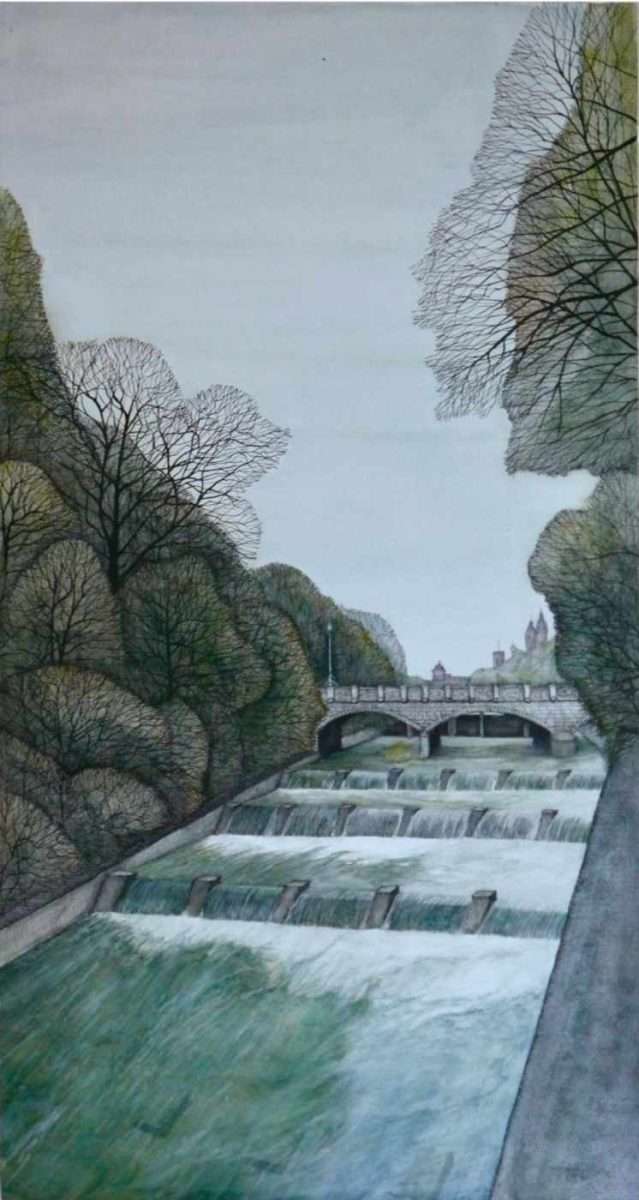 Stefania Peter präsentiert zwei Werke, ausgeführt mit einer Kombination aus Tusche und Aquarell. Sie nennt die Werke „Waterpower I und II“. Auf beiden Werken ist die Zeichnung die Grundlage der Gestaltung. Die Anordnung der Baumreihen folgt Elementen regulierter Wasserläufe. Auf einem Werk entlang einer vertikalen Kaskade, auf dem anderen horizontal. Anhand der Farbe und Dichte der Baumkronen scheint es sich um zwei Jahreszeiten zu handeln. Auf beiden Werken wirkt der Himmel in einheitlichen Tönen verschlossen. Interessant ist die fraktale Gestaltung der Baumkronen und der etwas strengere Ansatz bei der Gestaltung der baulichen Dimensionen der Wasserläufe. Dieser Unterschied im Ansatz assoziiert die Frage der Ökologie. Wir „dressieren“ die Natur zu sehr. Wir nehmen den natürlichen Lauf der Gewässer, die Flächen der Wälder und die Ausbreitung der Wiesen weg. Während der Wasserlauf durch Mauern und Dämme bestimmt ist, wird der Wald noch freier in seiner Ausbreitung dargestellt. Die Künstlerin scheint die Sorglosigkeit bezüglich der Folgen der Ausbeutung natürlicher Ressourcen anzudeuten. Wir erkennen die Gefahr nicht, wenn sie beginnt, sondern erst, wenn der Schaden bereits eingetreten ist.