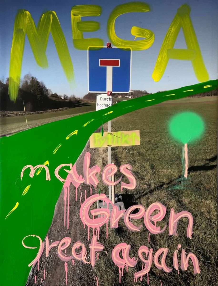 Andreas Pytlik präsentiert einen Fotodruck mit dem Titel „Megagrün“. Auf ein Foto einer prosaischen Landschaft greift er durch Collagieren, Malen/Übermalen und Schriftzüge ein. Wir erkennen einen Ausschnitt aus einem Druck, der „Weg / Schule“ zu sagen scheint. Darüber platziert er ein Verkehrsschild für eine Sackgasse, als wolle er die vereinfachte, auf Marketing und Profit ausgerichtete Bildung hinterfragen. Er schlägt grüne Farbe für den Asphalt vor. Sein künstliches Bäumchen, in intensivem Grün ausgeführt, finden wir auf einer vergilbten Wiese. Sogar seine Signatur fügt sich in diese Hinterfragung ökologischer und sozialer Dilemmata der Gegenwart ein. Die gesamte Komposition wird mit dem Schriftzug angeboten: „Grün wieder wichtig machen“. Diese Problematisierung des Zustands der Zivilisation offenbart unsere Vernachlässigung in allen ökologischen Fragen, von sozialen Ungerechtigkeiten zwischen offiziell Gebildeten und positionierten oder ungebildeten mächtigen Klassen bis hin zur Skrupellosigkeit gegenüber der natürlichen Umwelt. Es scheint, dass die Älteren die Probleme erkennen, aber junge Generationen, die mit Smartphones und sozialen Netzwerken aufgewachsen sind, selbst einen Sturm nicht als normalen Ablauf natürlicher Prozesse wahrnehmen. Sie empören sich erst, wenn der Strom ausfällt und ihre Akkus leer sind. Vielleicht schauen sie dann aus dem Fenster oder spazieren durch die Umgebung. Vielleicht erleben sie diese hinterfragende Landschaft als Warnung vor der Entfremdung von der Natur.
