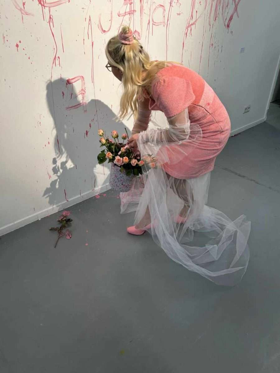 Josefine Pytlik präsentiert sich mit einer Installation bestehend aus einem Objekt und einer Performance. Die Künstlerin ist auffällig und passend gekleidet – in einem Outfit, das in Teilen an ein Brautkleid erinnert und somit eine Feierlichkeit assoziiert. Sie schreibt an die Wand der Galerie mit roter Farbe, die Opferbereitschaft, einen weiblichen Zugang oder die Auseinandersetzung mit Feminismus symbolisieren könnte. Die Rosen, die sie während der Aktion auf dem weißen Untergrund trägt, verweisen ebenfalls auf Zartheit und Sensibilität. Sie sind jedoch nicht rot und auch keine Nelken – somit lässt sich die Arbeit nicht mit revolutionären Ideen assoziieren.