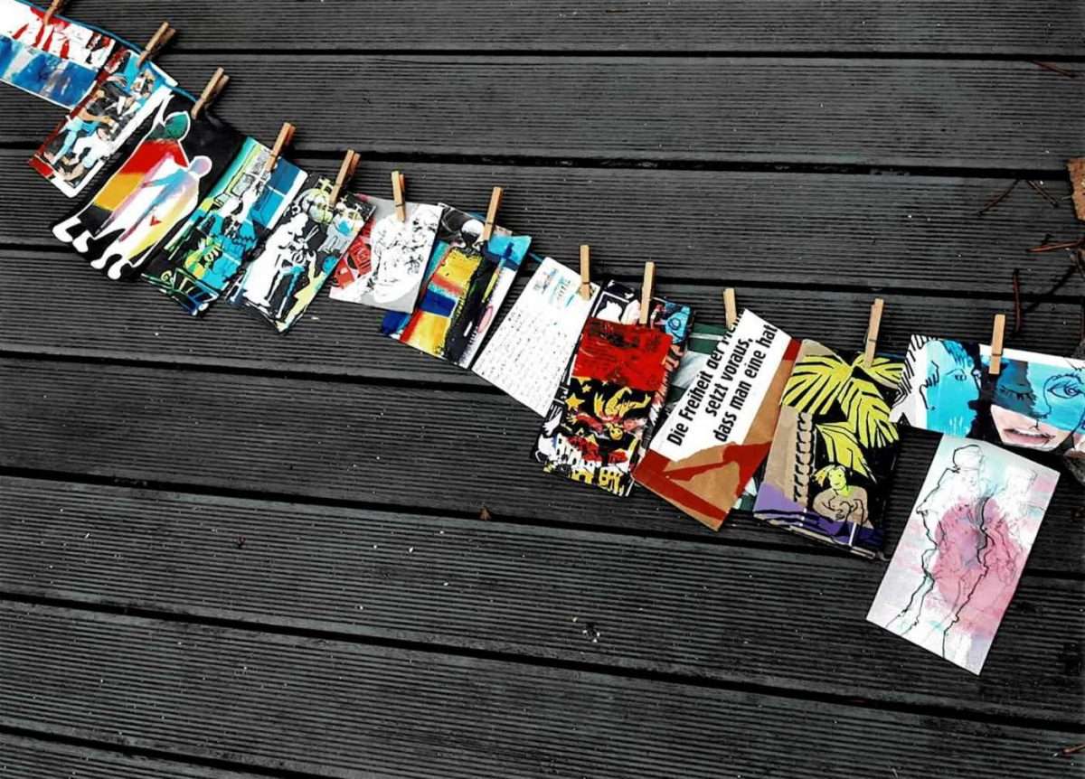 Christine Rieck-Sonntag erinnert uns hervorragend an eine archaische Kommunikationsform, die Post. Es scheint, dass sie und Anastasija Tonkova Werke wie Postkarten ausgetauscht haben. Diese Artefakte, alle kleine bildnerische Werke, hängt die Künstlerin fantasievoll mit Wäscheklammern an eine Schnur. Die Reihenfolge kann chronologisch oder zufällig sein. Darin finden wir vielfältige bildnerische Artefakte, wahrscheinlich Ausdrücke momentaner persönlicher Zustände, Eindrücke und Gedanken der beiden Künstlerinnen. Es gibt malerische, grafische, textuelle, portraitartige, manchmal collagierte Ausdrücke. Diese Kommunikationsweise weckt Erinnerungen. Wir müssen uns daran erinnern, wann wir selbst jemandem einen Brief, ein Telegramm oder eine Postkarte geschickt haben. SMS, WhatsApp, Facebook oder Instagram-Nachrichten haben die physische Kommunikation ersetzt. Persönliche Kommunikation ist veraltet, obwohl nur ein direktes Gespräch bei einem Kaffee oder einem anderen Getränk den Moment und die zwischenmenschliche Beziehung besser ausdrücken kann. Ich glaube, dass ein direkter Blick und ein ausgesprochener Satz viel reicher sind als alle stets oberflächlichen Internetkommunikationen.