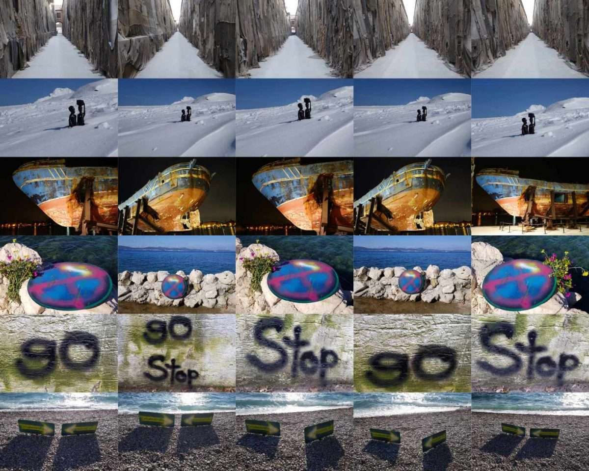 Hari Sedlmeier präsentiert collagierte fotografische Werke. Vor uns stehen zwei Gruppen von Aufnahmen, die die Gegenwart an einem entfernten Ort hinterfragen. Die Werke tragen den Titel „Stopp und Geh / von der dunklen Seite der Alpen / zur hellen Seite des Meeres I. und II.“. Das erste Werk assoziiert die Idee von Erwartungen, obwohl wir im unteren Teil der Collage auch ein Verbotsschild für Halten und Parken sehen. Diese Zeichen verweisen auf Direktiven und Anforderungen, eine Art Katz-und-Maus-Spiel. Sie fordern Gehorsam und Demut, trotz der Freude, die der Titel des Werks suggeriert. Das zweite Werk scheint den Zustand „…auf der hellen Seite des Meeres“ darzustellen. Hier sehen wir Schatten, aber auch symbolische Figuren von Menschen an der Küste dieses Meeres. Neben Motiven des Blaus und Figuren, die sich nach der Ankunft am gewünschten Ziel zu entspannen versuchen, finden wir auch Verbote, den Schriftzug „Ohne Zuhause“ und Aufnahmen von gestapelten Benzinkanistern. Diese dargestellten Situationen hinterfragen subtil die Wünsche und Hoffnungen der Besucher, die wir Touristen nennen, sowie das Angebot der Menschen, die am Meer leben und durch Missverständnisse der Wünsche überhöhte Preise für Dienstleistungen und Verbote auferlegen. Hervorragende Werke, die sowohl die Gäste als auch die Gastgeber einer großen Anzahl von Menschen hinterfragen, die einfach die Vorzüge des Mittelmeers genießen möchten.