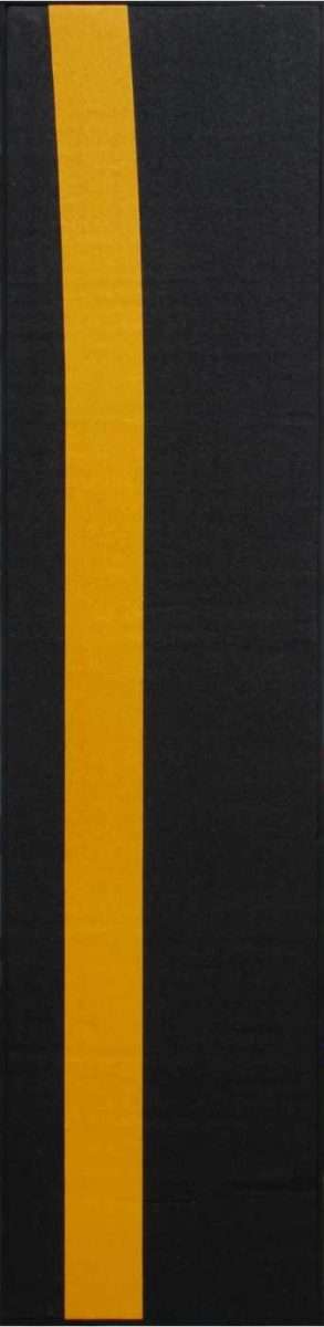 Severin Zebhauser präsentiert ein einfaches Werk, dessen Titel keine Bestimmung verrät. Er nennt es „Ohne Titel“, sodass dem Betrachter klar ist, dass er es selbst erlebnismäßig bestimmen muss. Es handelt sich um ein Objekt von beträchtlichen Dimensionen, insbesondere in der Höhe, ausgeführt aus Sand, Bitumen und Markierungsband. Die Dunkelheit des Objekts steht im Kontrast zum gelben Band. Dieses markiert meist ein Verbot, es sei denn, es dient als Halterung bei Arbeiten. Gelbes Band, z. B. im Verkehr, markiert eine Grenze, eine symbolische Barriere. In diesem Sinne können wir auch dieses Werk erleben, wo das Band vertikal dargestellt wird. In der heutigen Zeit ist es nicht ungewöhnlich, anzunehmen, dass der Künstler die Verbote hinterfragt, deren Zeugen wir sind. Künstler sind sich bewusst, dass die Zeit, in der wir leben, Rahmenbedingungen vorgibt. In einigen müssen wir teilnehmen, in anderen wollen wir es nicht. Die Moderne, die wir Kapitalismus nannten, entwickelt sich in Richtung Technofeudalismus.