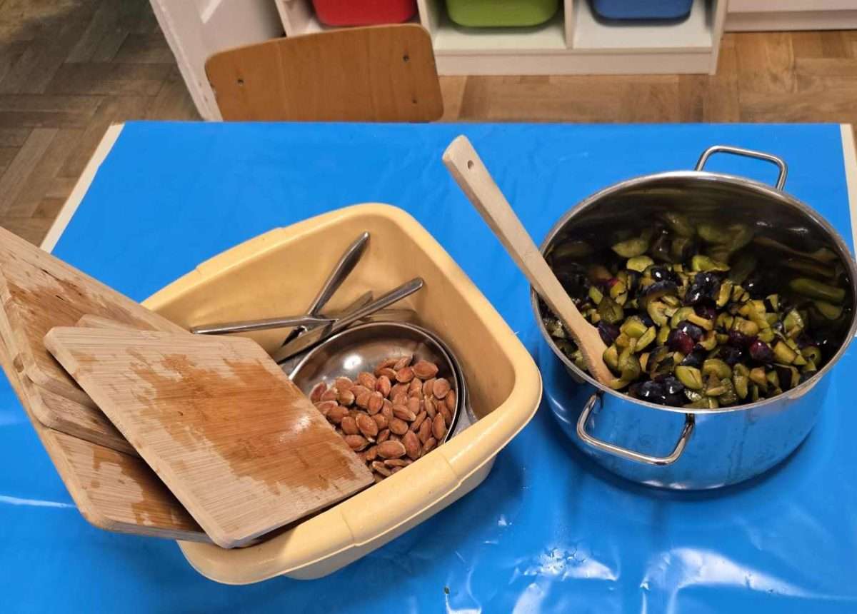 U početnoj fazi, najmlađi su s oduševljenjem prali šljive, osjećajući ih pod prstima i promatrajući kako se čiste i mijenjaju boju. Sortiraju ih, premiještaju i broje. Starija djeca, pomoću prilagođenog pribora, uz oprez i nadzor, sudjelovala su u vađenju koštica i rezanju voća. Korištenje pravih ali prilagođenih alata, poput malih noževa i dasaka za rezanje, daje im osjećaj važnosti i odgovornosti. Tijekom procesa, posebna pažnja usmjerena je na higijenu, kako osobnu, tako i površina, pribora za rad I samog voća. Cijela priprava zahtijeva timski rad i podjelu zadataka.Tijekom ovih aktivnosti, poticali smo razvoj krupne I fine motorike, koordinacije oko-ruka, senzorne percepcije, bogatili rječnik, spajali broj i količinu, istovremeno razvijajući koncentraciju, strpljenje, samopouzdanje i osjećaj kompetentnosti. Djeca su potaknuta na dvosmjernu komunikaciju i interakciju, međusobno i sa odgojiteljicama. Proces kuhanja pekmeza omogućio je djeci promatranje fizikalnih i kemijskih promjena na konkretan način, pružajući prigodu za, većini, potpuno novo iskustvo.