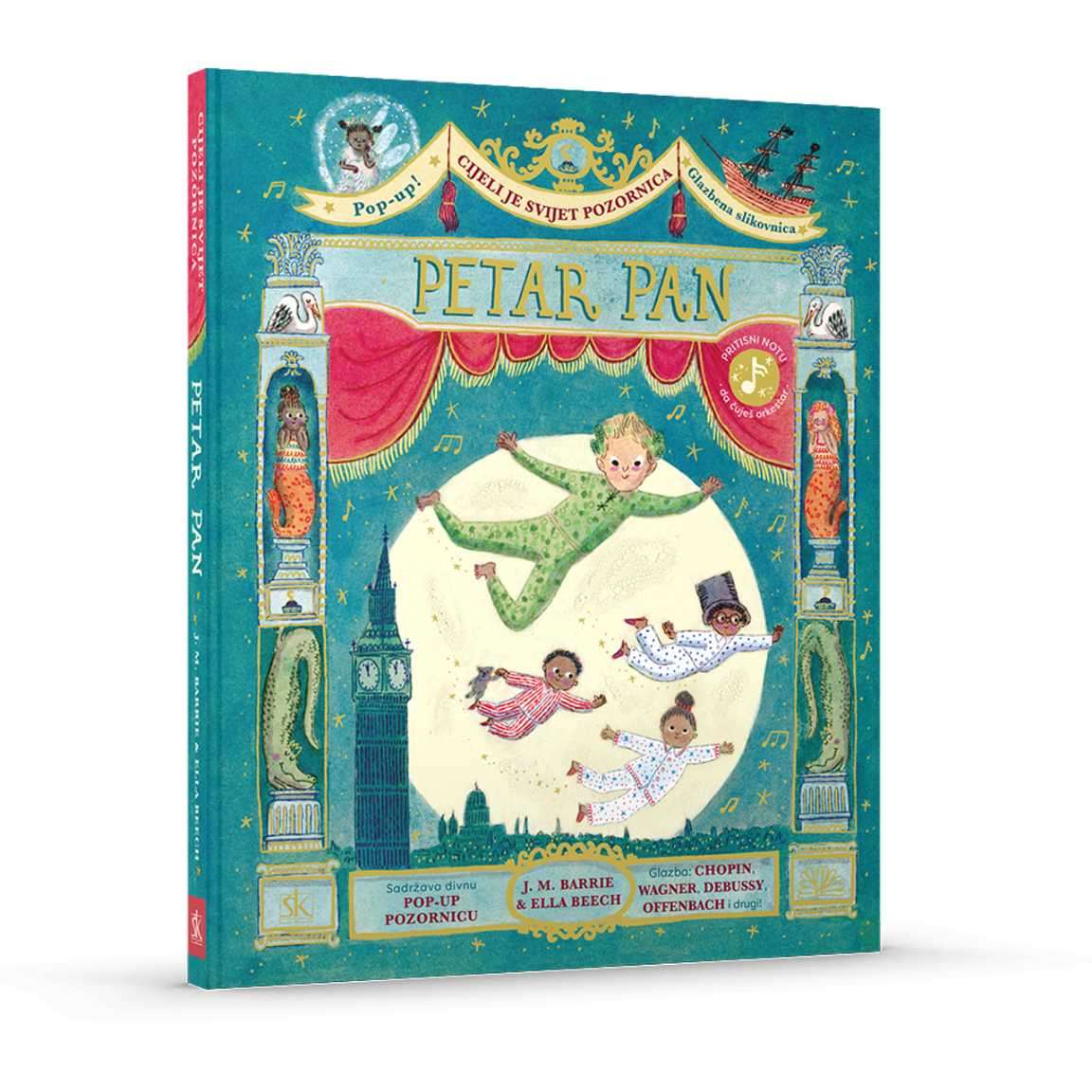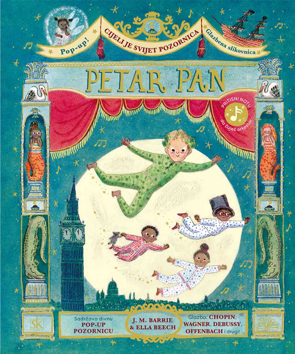 Petar Pan, dječak koji leti i ne želi odrasti, Wendy, John, Michael, Zvončica, Izgubljeni dječaci, Ljiljana Lijepa, Strašnik i zloglasni gusar Kapetan Kuka junaci su jedne od najljepših priča svih vremena koju je prema izvornom djelu Jamesa Matthewa Barrieja prepričala i ilustrirala Ella Beech. Na svakoj stranici raskošne slikovnice nalazi se simbol note. Kad ga pritisnete, začujete glazbu Jacquesa Offenbacha, Nikolaja Andrejeviča Rimski-Korsakova, Richarda Wagnera, Claudea Debussyja, Frédérica Chopina i Roberta Schumanna. Mudro izabrani glazbeni ulomci savršeno dočaravaju atmosferu pustolovine u koju se upuštaju odvažni junaci.