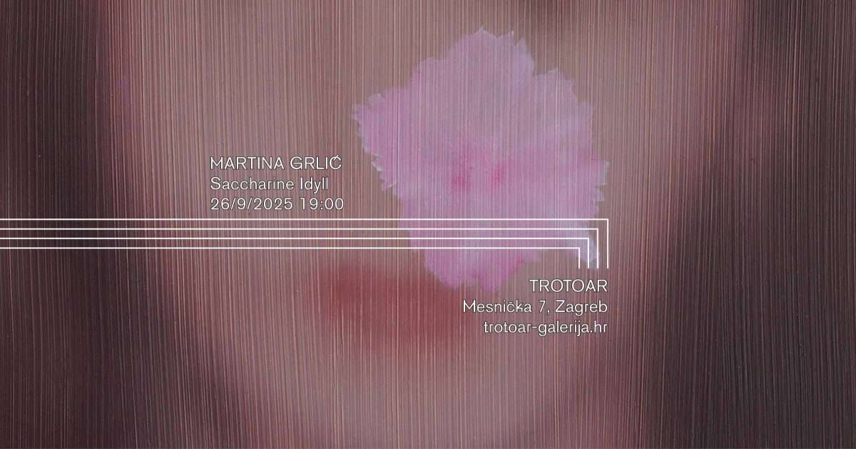 Trotoar predstavlja novu izložbu Martine Grlić, jedne od najistaknutijih hrvatskih slikarica. Grlić je razvila prepoznatljiv slikarski izraz utemeljen na figuraciji i narativnom oblikovanju prizora, a kroz posljednje cikluse istražuje odnos osobnog i kolektivnog pamćenja. (Auto)etnografskim pristupom koristi pronađene fotografske izvore – obiteljske albume i arhive – koje pretvara u prizore suptilnih distorzija. Njezini radovi otkrivaju kako se nostalgija, ideologija i društveni obrasci nastavljaju upisivati u svakodnevicu, čak i kada sustav koji ih je oblikovao više ne postoji. I u novom ciklusu Saccharine Idyll (Ušećerena idila) Grlić razvija temu nestabilnosti sjećanja i poimanja ženskosti, dok paradoks između idiličnih pastoralnih prizora i satire postaje još izraženiji.