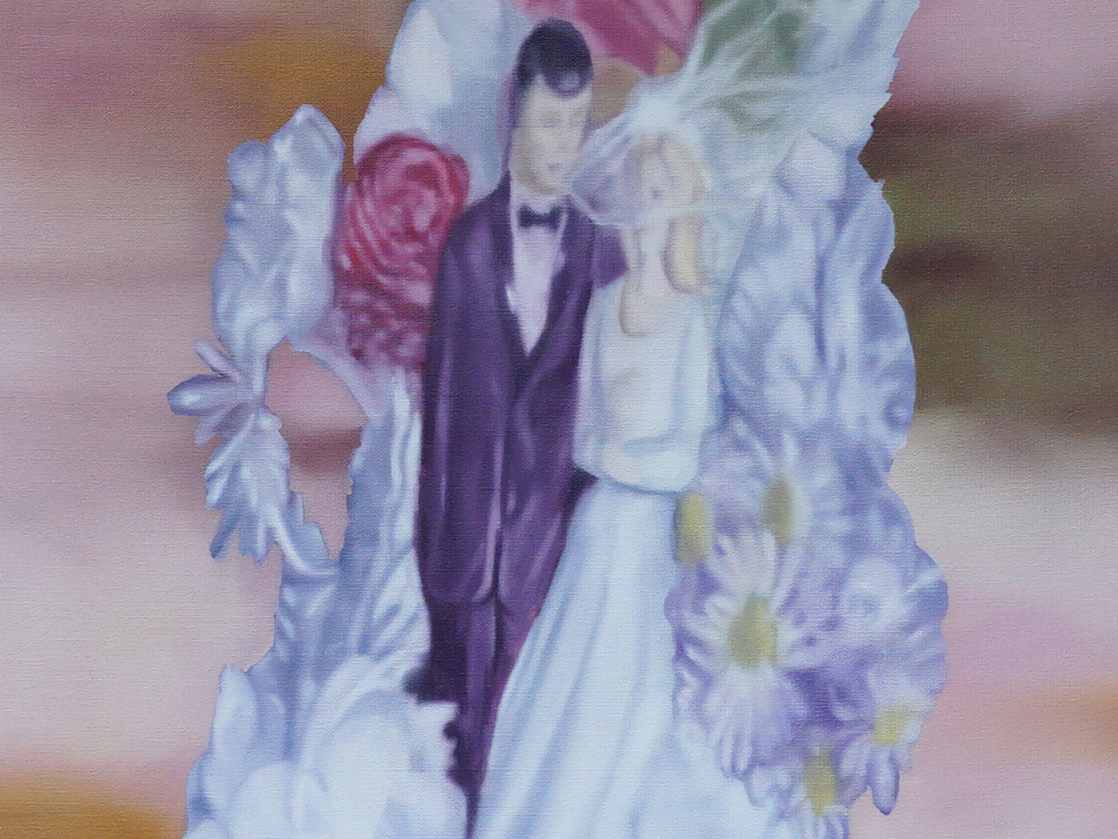 Sve se priče sentimentaliziraju. Kao i sjećanje. Kada za polazište izabire fotografije iz obiteljskih albuma, Martina Grlić uvlači se u varljivost pamćenja (jer joj je nemoguće umaći) i svjesno se njome koristi kao radnim materijalom. Njezine slike nisu dokumenti, nego konstrukti: ono što nas privlači nije istinitost prizora, već način na koji je aranžiran da nas zadovolji. Rekviziti dekora lebde nad sfumato tratinčicama i portretima nasmijanih žena. Sve je ružičasto, mekano, preslatko. Idila podrhtava po rubovima. “Nema ništa lijepo u ovim slikama”, kaže autorica; poznato se odjedanput pretvara u strano. Ušuljava se nelagoda. Ono što se isprva činilo ljupkim otkriva drugi, nimalo pitomi, registar: matricu želja i strahova. Simboli koje poznajemo – bijela vjenčanica, kupid, blještavi nakit – istodobno prizivaju obećanje i prijetnju. Postaju nositelji kolektivnih iluzija, relikti ideologija koje su nam nekad zadavale okvire, a sada, otrgnuti iz svojih izvornika, vrte se kao defektne heraldičke značke.