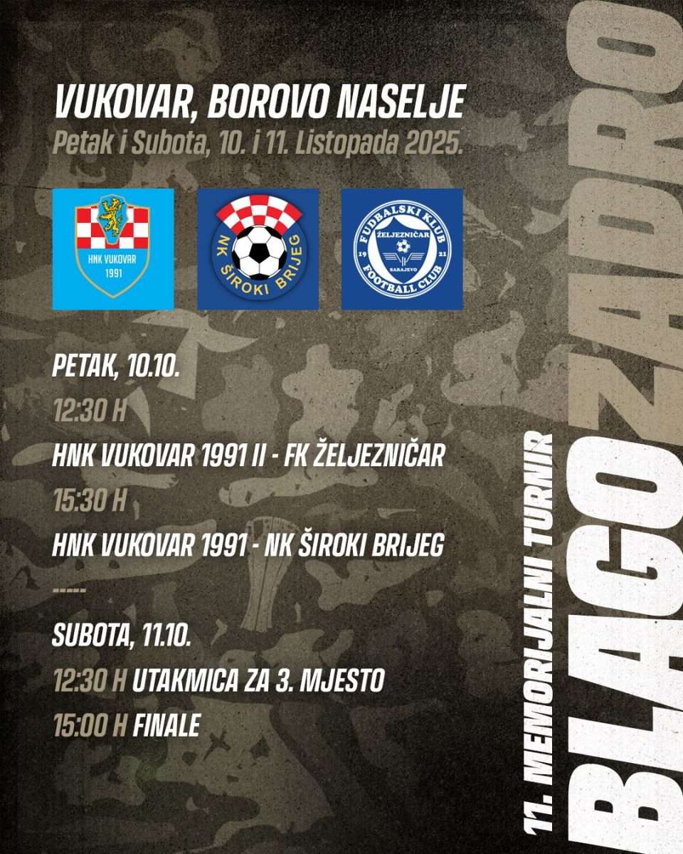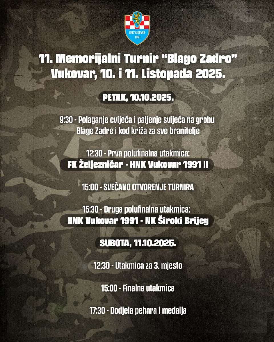 Vukovarsko jedanaesto izdanje Memorijalnog turnira „Blago Zadro“, tradicionalnog sportskog događaja koji okuplja klubove, igrače i navijače u čast heroja; simbola hrabrosti, zajedništva i ponosa Vukovara. Turnir se održava 10. i 11. listopada 2025. godine na stadionu u Borovu naselju, a i ove godine očekuje se lijepa sportska atmosfera ispunjena emocijom i zajedništvom koje ovaj događaj uvijek nosi. U sklopu programa, u petak, 10. listopada, s početkom u 9:30 sati, održat će se polaganje cvijeća i paljenje svijeća na grobu Blage Zadre te kod križa za sve branitelje. Svečano otvorenje turnira planirano je istog dana u 15:00 sati, neposredno prije druge utakmice prvog dana natjecanja.