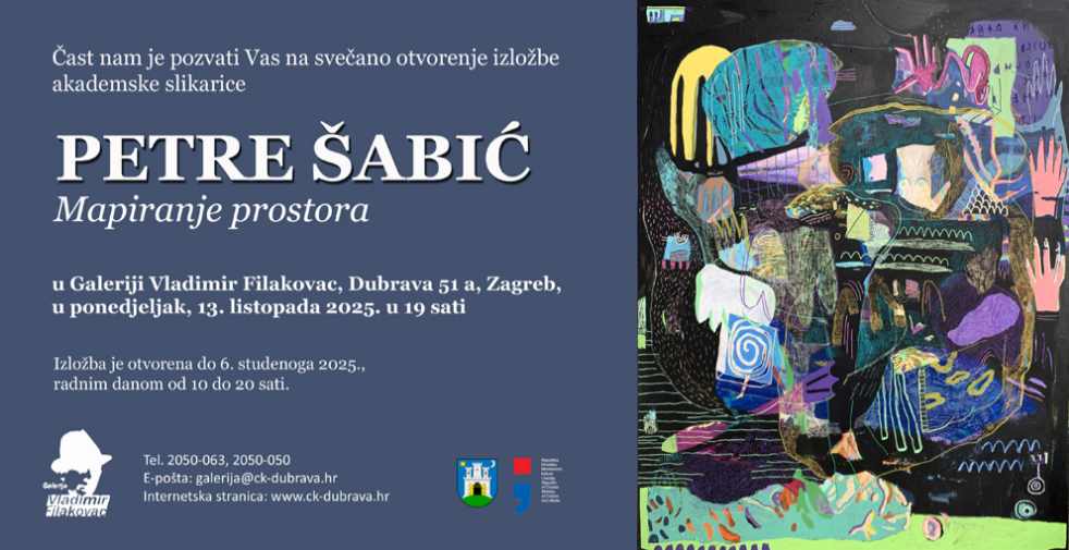 U Galeriji Vladimir Filakovac, Dubrava 51 a, otvara se 13. listopada u 19 sati izložba akademske slikarice Petre Šabić pod nazivom “Mapiranje prostora”.