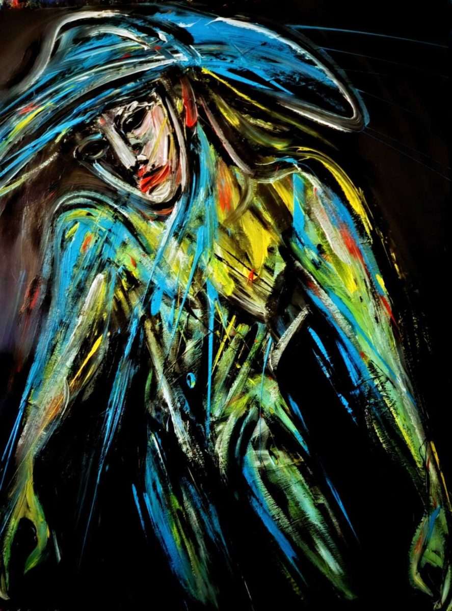 Fragmenti boje se sklapaju, stvarajući jedinstveni oblik živućeg nositelja maske sa šeširom ili kosom, u trenutku potpune tišine i razdirućeg bola.