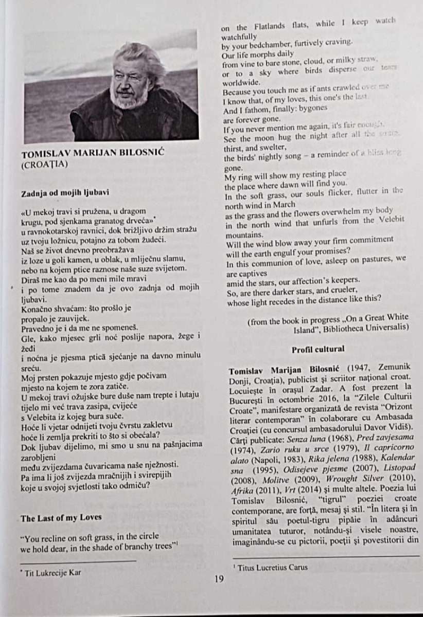 Novo izdanje tako predstavlja još jedan važan doprinos hrvatsko-rumunjskim kulturnim vezama, ali i još jednu potvrdu međunarodne vidljivosti Bilosnićeva književnog opusa, koji u kombinaciji poezije i slikarstva sve snažnije gradi prepoznatljiv umjetnički identitet na europskoj kulturnoj sceni.