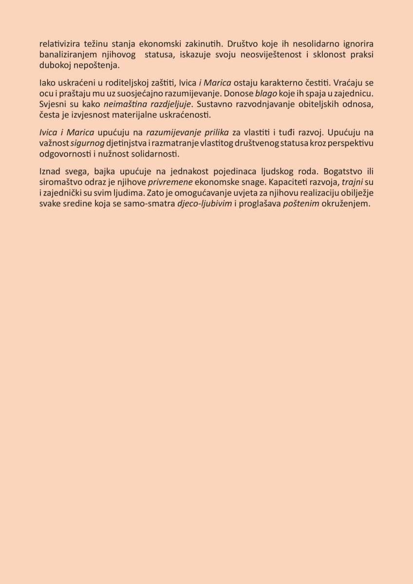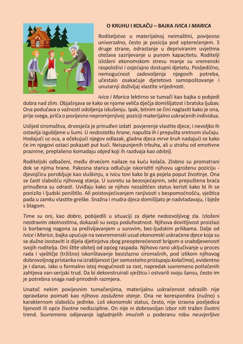 Priča o Ivici i Marici zaživjela je u mnogim interpretacijama. Pouka njene priče raznovrsno je tumačena. O višeslojnosti sadržaja i relevantnosti njene ideje u kontekstu života suvremene djece, u tekstu Željke Pintar O kruhu i kolaču