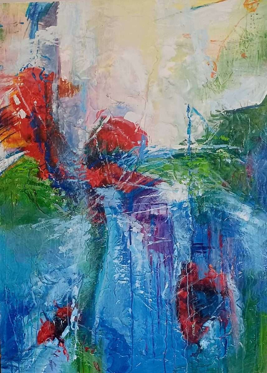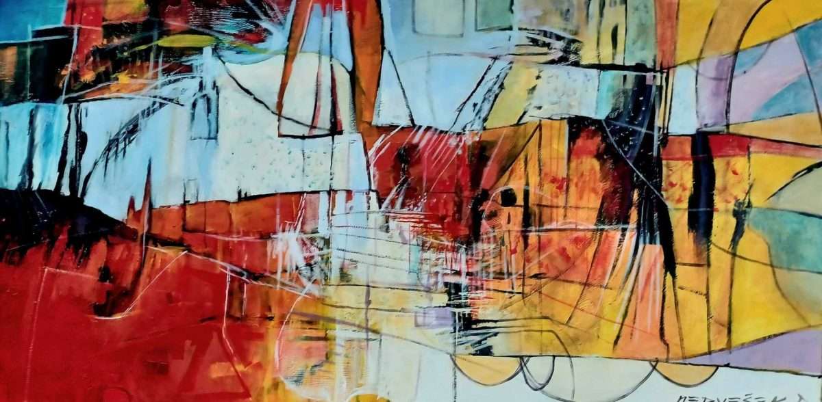 Pred nama je noviji ciklus apstrakcija Damira Medvešeka, izrazito jak koloristički pristup u uzbudljivoj kompoziciji razigranih motiva, neprekidnog gibanja obojanih fragmenata, ploha, oblika, mrlja i pravaca.