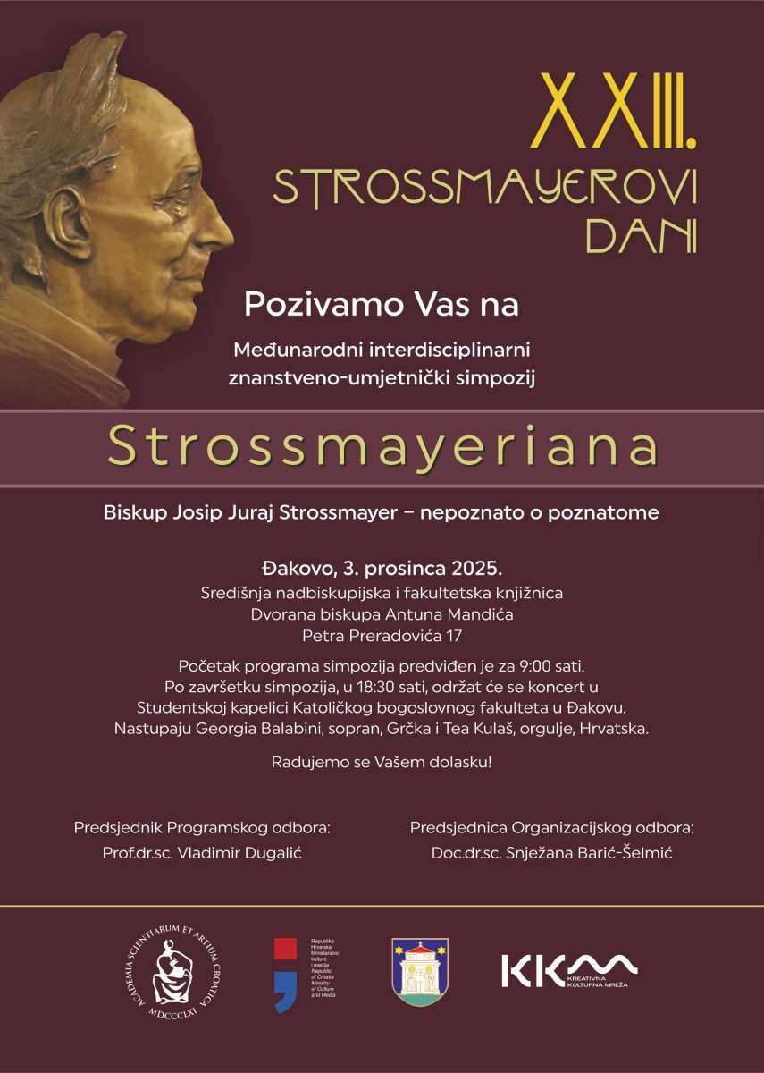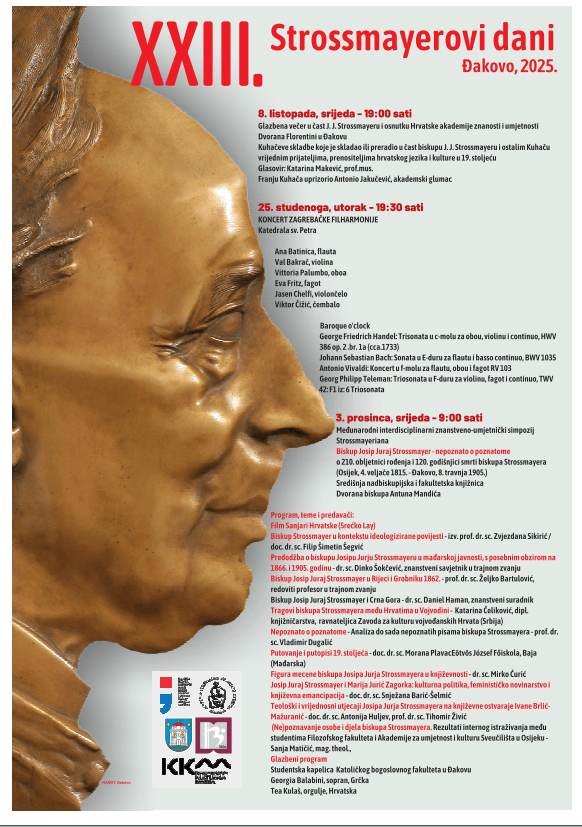 U sklopu XXIII. Strossmayeovih dana te obilježavanja 210. obljetnice rođenja biskupa Josipa Jurja Strossmayera, jednog od najznačajnijih hrvatskih kulturnih i političkih vizionara 19. stoljeća, održava se cjelodnevni znanstveni simpozij koji okuplja ugledne znanstvenike, kulturne djelatnike i istraživače iz Hrvatske, Mađarske i Srbije. Program započinje projekcijom filma Sanjari Hrvatske (Srećko Lay), nakon čega slijedi niz tematskih izlaganja posvećenih Strossmayerovom djelovanju u području historiografije, kulturne politike, međunarodnih odnosa, ekonomskog razvoja i književne recepcije.