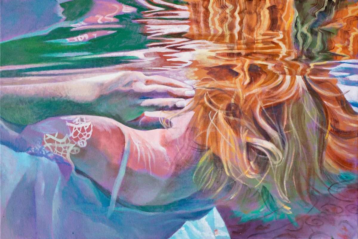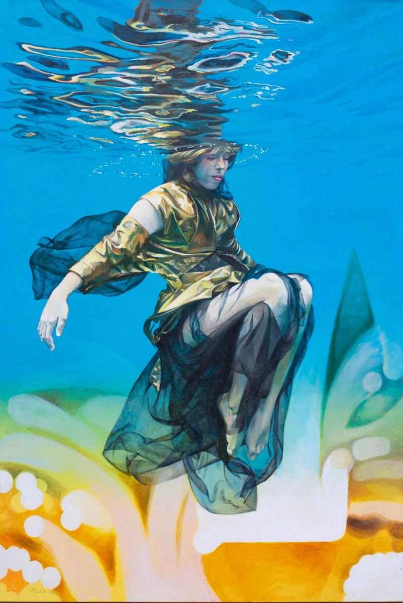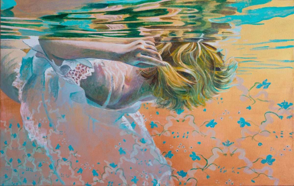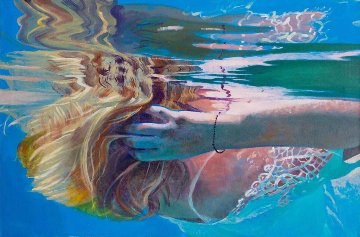 Ivanina platna otvaraju pogled iz neočekivane „underwater“ perspektive: prema površini koja treperi i priziva podsvjesno. U tom vodenom prostranstvu ženska tijela plutaju bez težine, uronjena u stanje meditativnog smirenja. Voda postaje metafora unutrašnjeg pejzaža — mjesta gdje misli utihnu, a figura se pretvara u osjećaj, refleksiju, senzaciju. To je prvi glas ovog vizuelnog dijaloga, onaj koji govori tiho, kroz svjetlost i usporeno vrijeme.