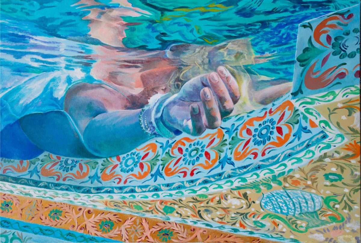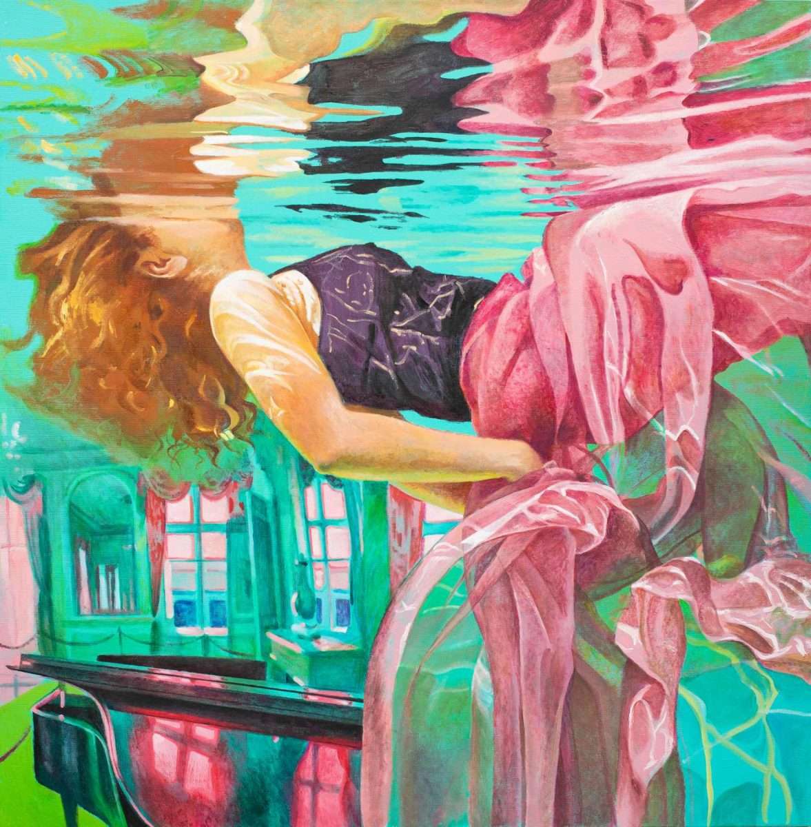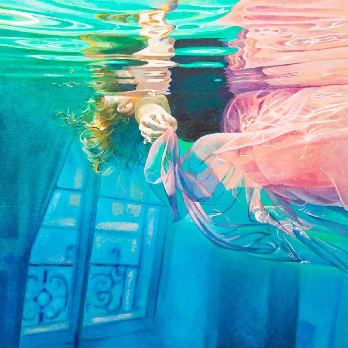 Ivanina platna otvaraju pogled iz neočekivane „underwater“ perspektive: prema površini koja treperi i priziva podsvjesno. U tom vodenom prostranstvu ženska tijela plutaju bez težine, uronjena u stanje meditativnog smirenja. Voda postaje metafora unutrašnjeg pejzaža — mjesta gdje misli utihnu, a figura se pretvara u osjećaj, refleksiju, senzaciju. To je prvi glas ovog vizuelnog dijaloga, onaj koji govori tiho, kroz svjetlost i usporeno vrijeme.