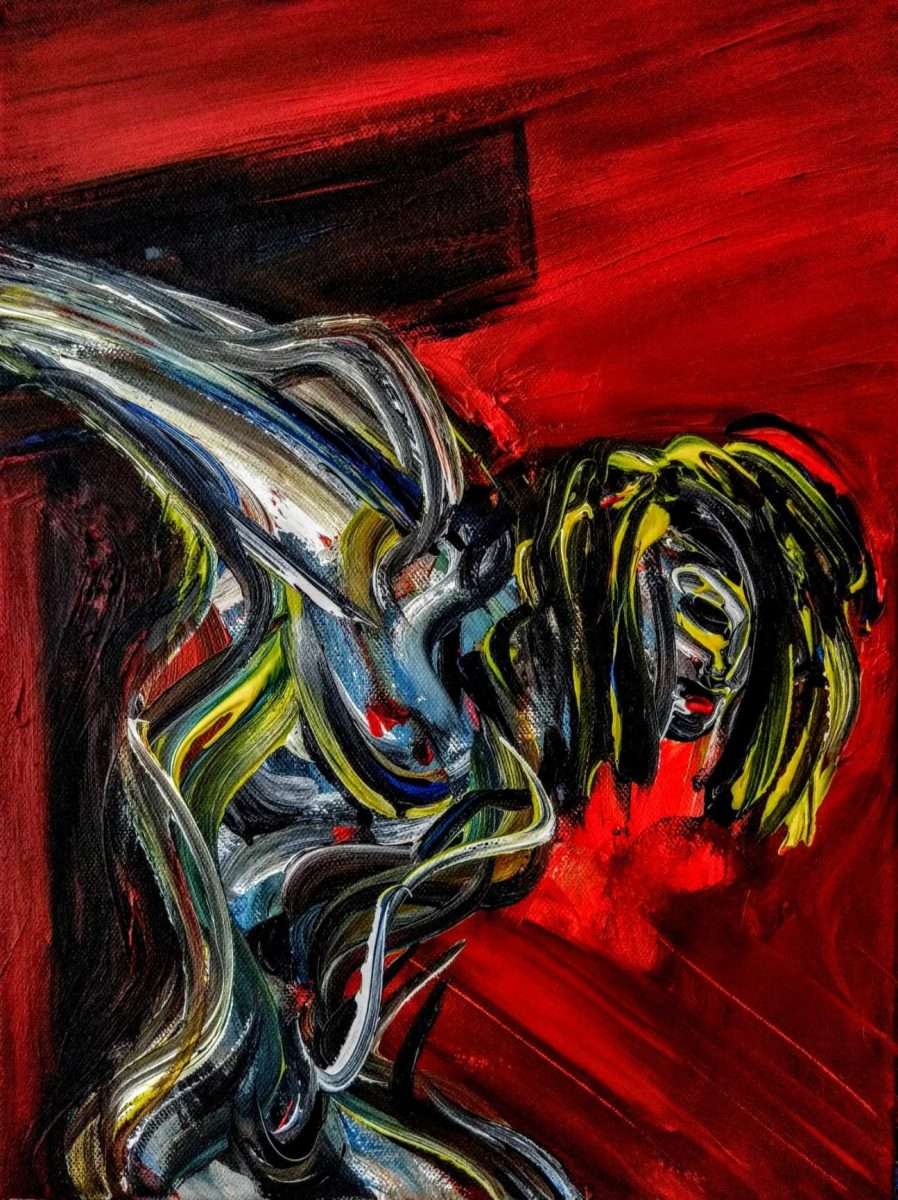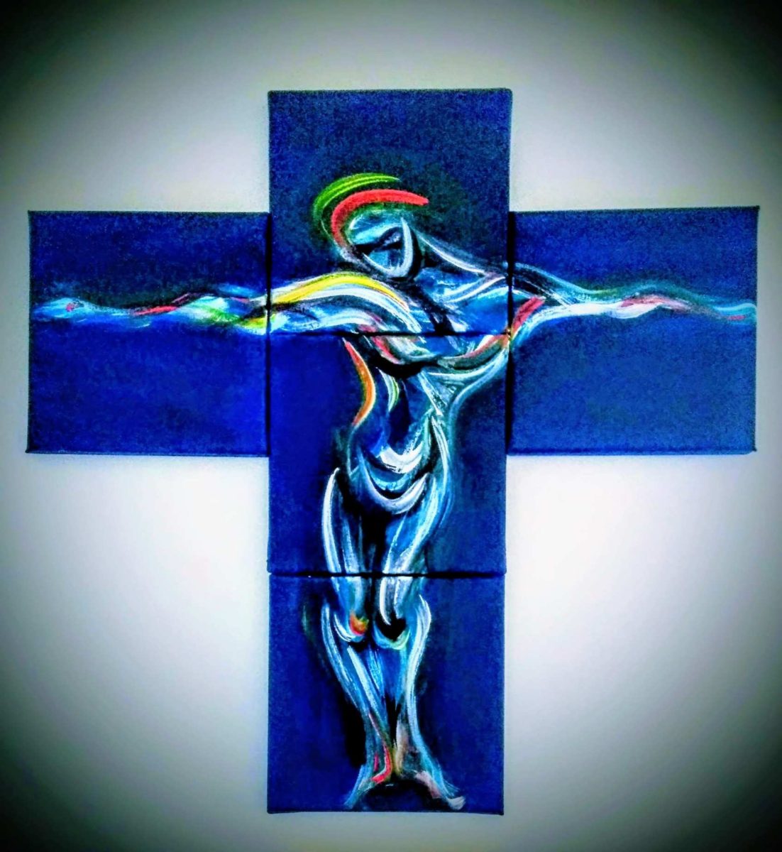 U ovom se ciklusu osobito ističe 5 panela, svaki 20×20 cm – znači 60×60, akril na platnu, s motivom Isusa na križu. Impresivna autorska konstrukcija.