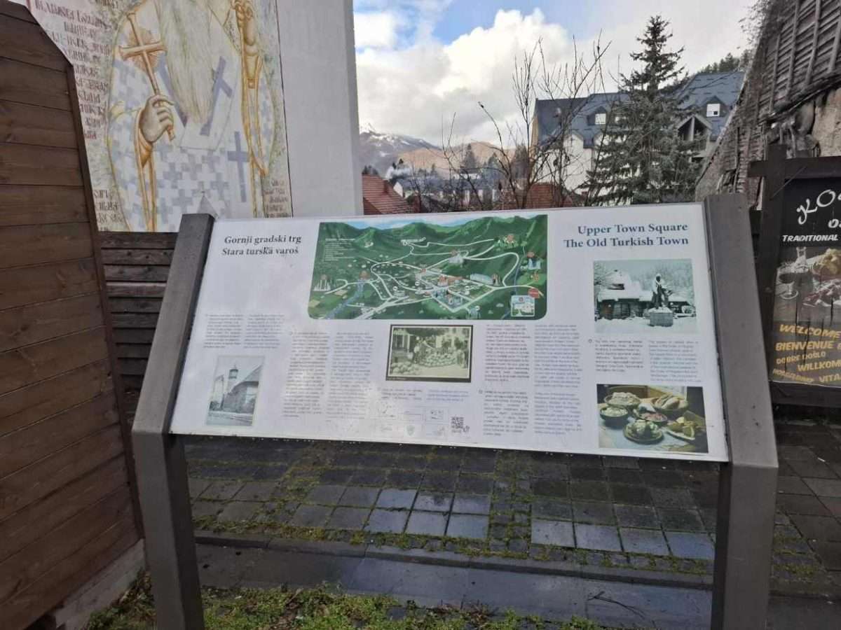 Nastavljam dalje i stižem do dijela koji se zove Stara turska varoš, na Gornjem gradskom trgu. Tu stoji pano sa natpisom: „Nalazite se na mjestu na kom su nekada bili dućani, hanovi, kuće za stanovanje i džamija. Tu je 1651. godine turski vojskovođa Ali-paša Čengić podigao utvrđenu varoš Kolašin. Po tadašnjim običajima, utvrđenje je podignuto u istoimenom selu, na raskrsnici značajnih puteva sa koje se mogao kontrolisati čitav kraj. Po završetku rata sa Turskom (1876–1878), poznatog u narodu kao Velji rat, Crna Gora postaje samostalna i nezavisna država. Odlukama Berlinskog kongresa biva teritorijalno proširena, a u njen sastav ulazi i Kolašin, koga postepeno naseljavaju crnogorska plemena Moračani i Rovčani. Turska varoš doživljava transformaciju…“