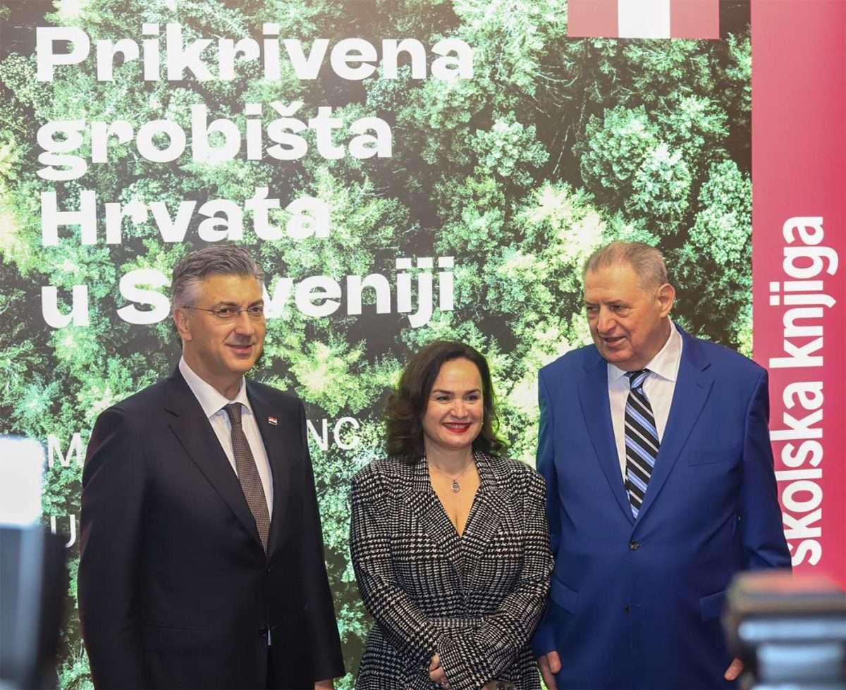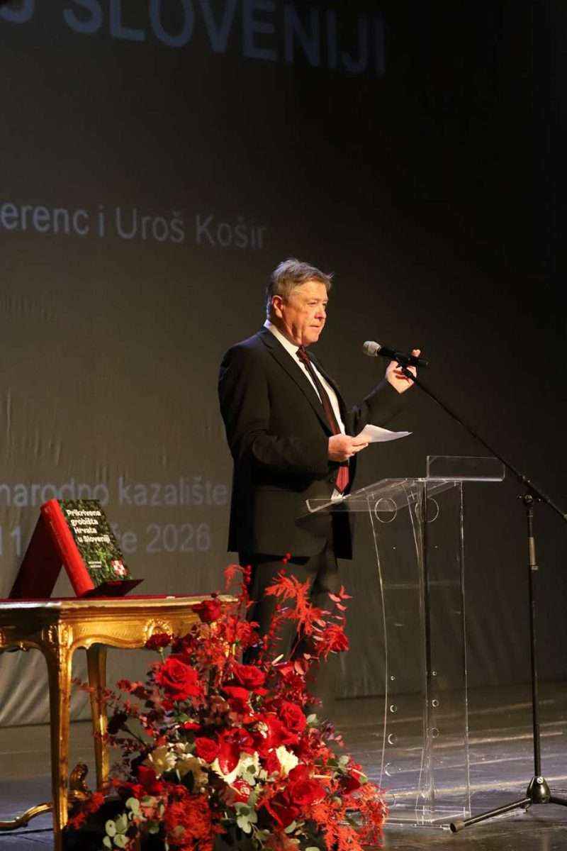 - Hrvatski premijer Andrej Plenković, predsjednik Hrvatskog sabora Gordan Jandroković, članovi Vlade Republike Hrvatske i drugi visoki uzvanici iz Slovenije i Hrvatske nazočili su predstavljanju monografije Prikrivena grobišta Hrvata u Sloveniji u srijedu, 11. veljače 2026., u Hrvatskome narodnom kazalištu u Zagrebu