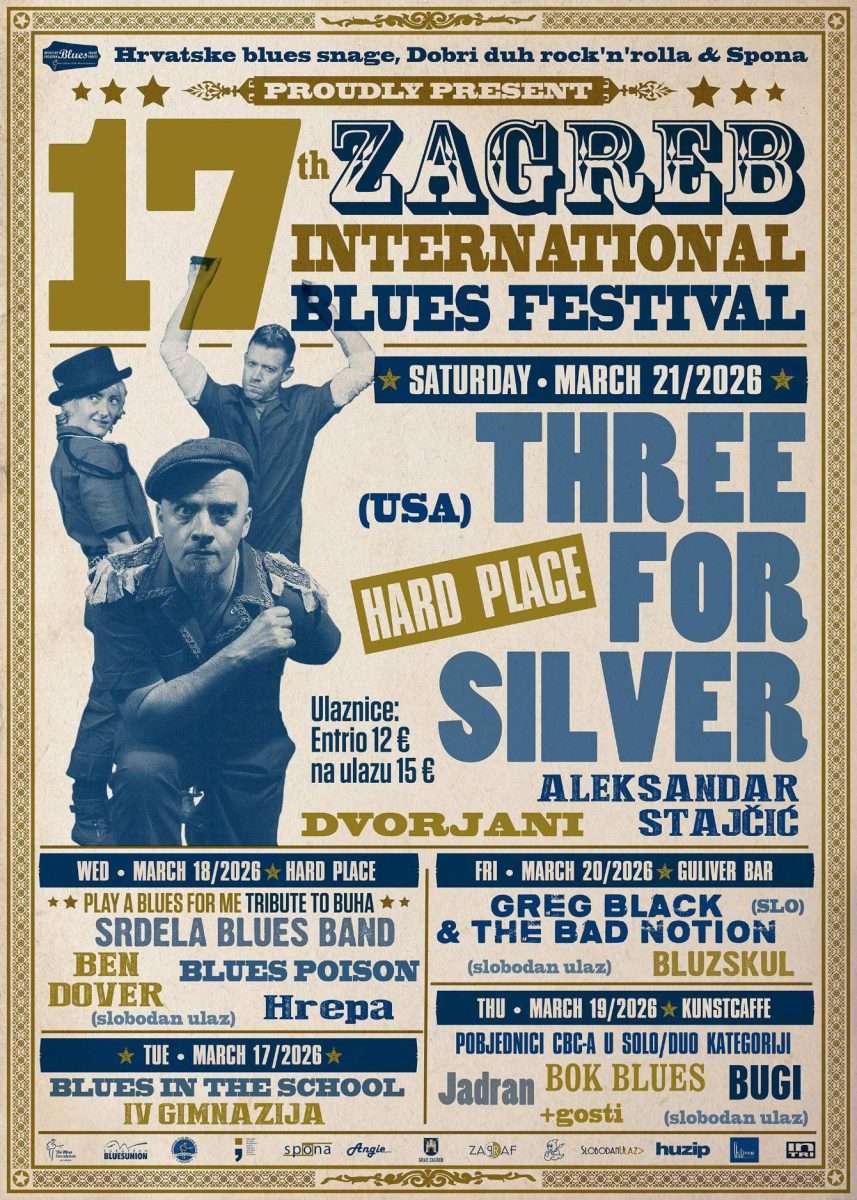 Glavni izvođači ovogodišnjeg 17-og izdanja Zagreb International Blues Festivala stižu nam iz američkog grada Portlanda. U Hard Placeu će u subotu 21.03.2026. zasvirati neponovljivi THREE FOR SILVER sa svojom zanimljivom kombinacijom zvukova koju oni nazivaju doom/folk/blues. I koliko god to čudno zvučalo njihova svirka i nastup su zaista nevjerovatni. Ne propustite ih po prvi puta čuti i vidjeti u Hrvatskoj jer im kritičari, a i publika, predviđaju veliku karijeru. Na bini Hard Placea podržat će ih ALEKSANDAR STAJČIĆ te duet DVORJANI (aktualni pobjednici Croatian Blues Challengea u solo/duo kategoriji).