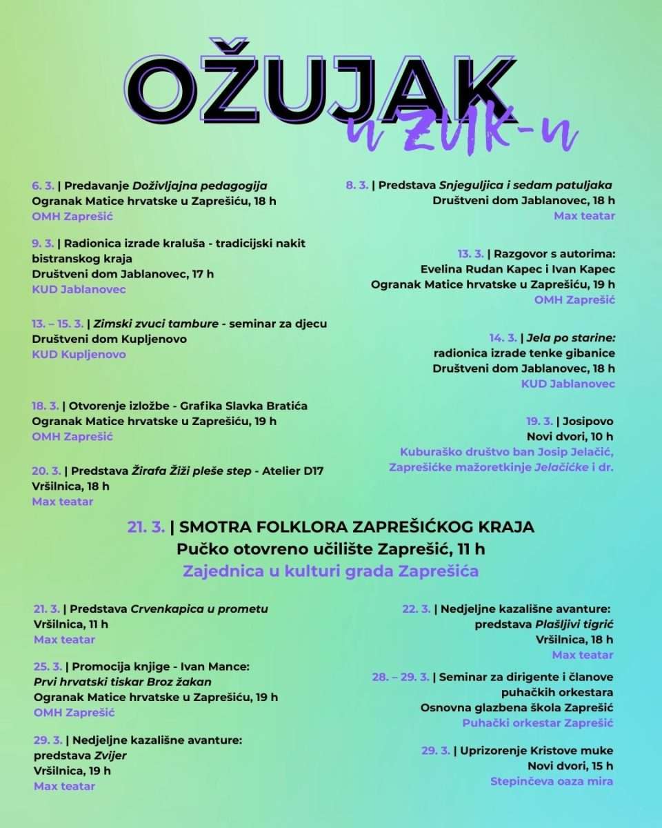 Članovi Zajednice u kulturi grada Zaprešića su u ožujku krenuli punom snagom s provedbom novih programa i organizacijom manifestacija, a vrhunac mjeseca je Smotra folklora zaprešićkog kraja u organizaciji ZUK-a – prilika da na jednom mjestu vidite najbolja kulturno-umjetnička društva našeg kraja. Uz folklor, očekuju vas predstave, radionice, izložbe i brojna događanja koja čuvaju našu tradiciju i običaje.