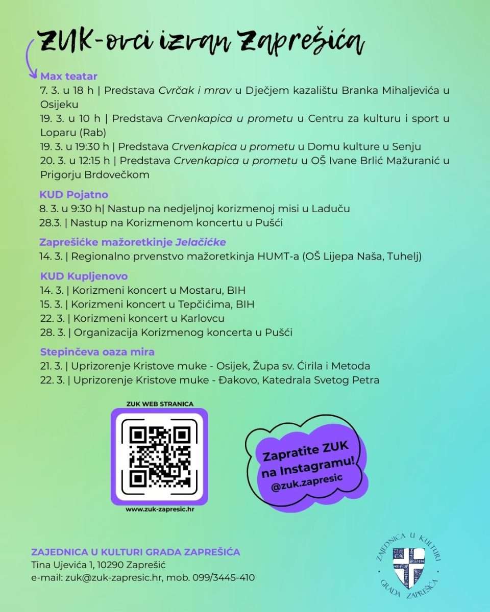 ZUK poziva sve ljubitelje kulture i umjetnosti da prate njihov rad na društvenim mrežama (Facebook i Instagram) i službenoj web stranici (www.zuk-zapresic.hr), gdje će redovito objavljivati vijesti o budućim događanjima. Za dodatne informacije kontaktirajte nas na zuk@zuk-zapresic.hr ili na broj 099/3445-410.