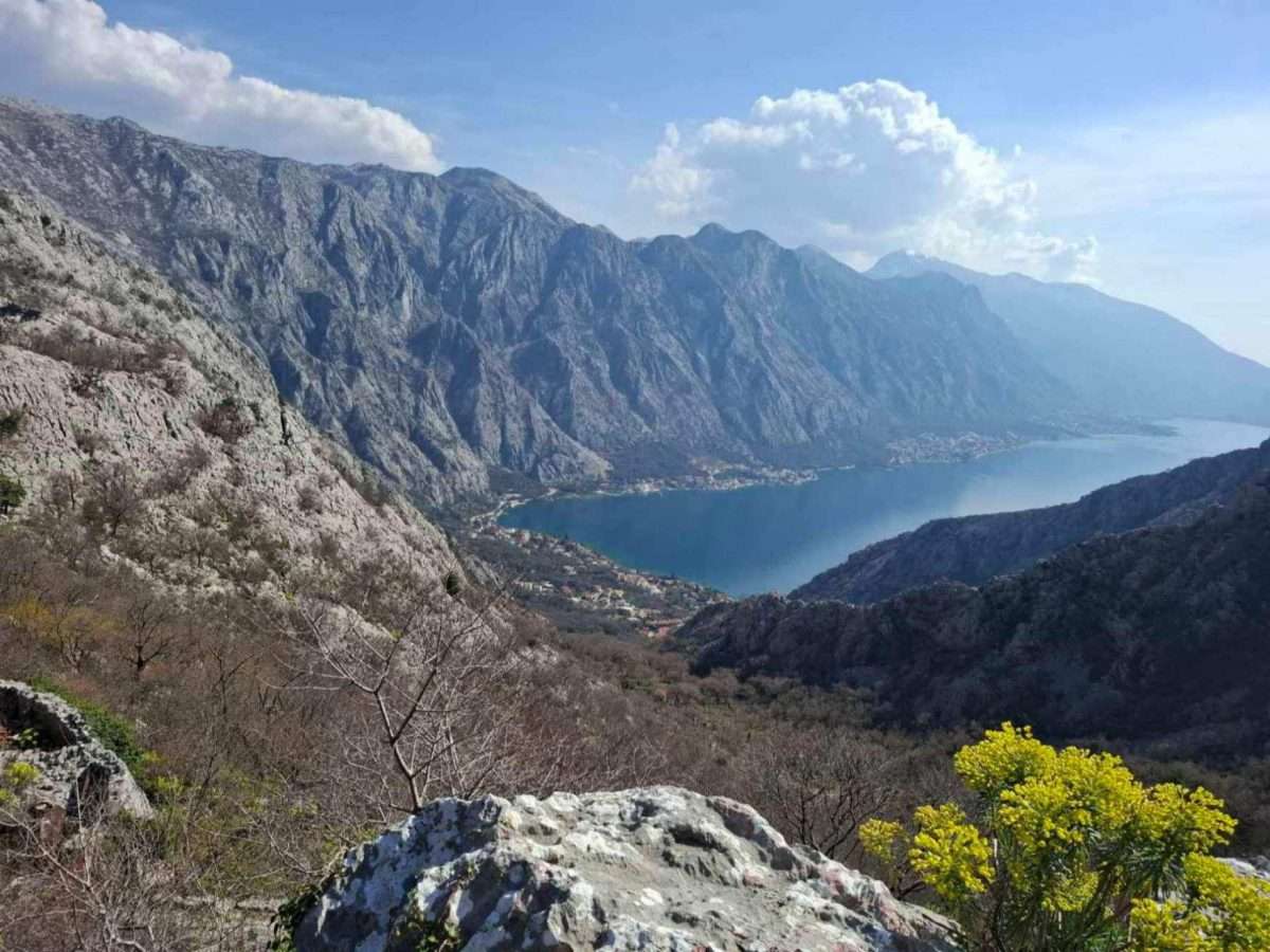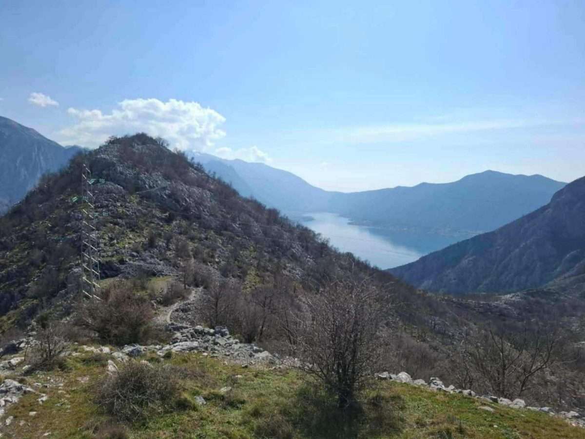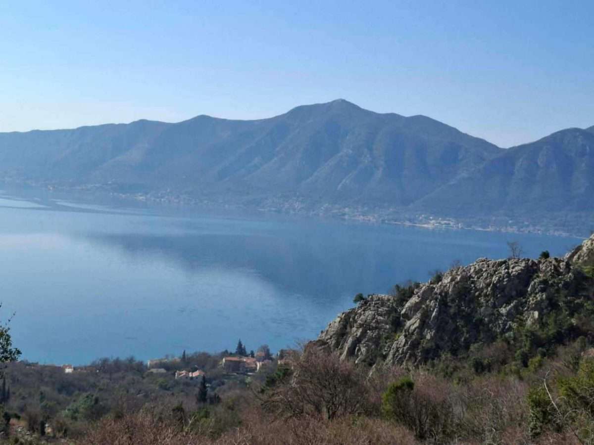 Zadržavamo se na ovom mjestu. Pogled koji se odavde pruža obuhvata čitavu širinu prostora i more i kopno, spoj Boke i njenog kamenitog zaleđa. Ispod nas se kao na dlanu otvara Bokokotorski zaliv, duboko usječen između planinskih vijenaca, dok se more presijava na jutarnjem svjetlu. Sa ove visine jasno se vidi kako se obala lagano spušta prema moru, đe su mala mjesta i kamene kuće poput bijelih tačaka razasute uz obalu. U daljini se prepoznaju linije Dobrote, Perasta i Risna, dok se iza njih uzdižu visoki kraški grebeni koji zatvaraju horizont.