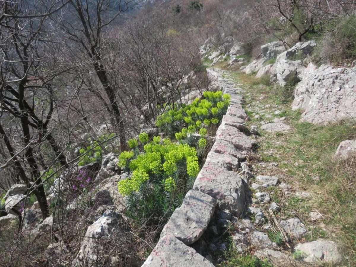 Samom stazom brojni su grmovi divljeg nara, (Punica granatuma) na njima još poneki plod ostao od jeseni. Prema zalažanskim gredama vide se, na samim vrhovima stijena, koze kako obitavaju na tim surovim liticama. Polako se uspinjemo ovim putem. Ovaj period godine, kada sunce i temperature nijesu tako jake, veoma je pogodan za ovakav uspon. Iako je uspon impresivan, ali i težak, svaki pogled na Bokokotorski zaliv ispuni čovjeka vedrinom.