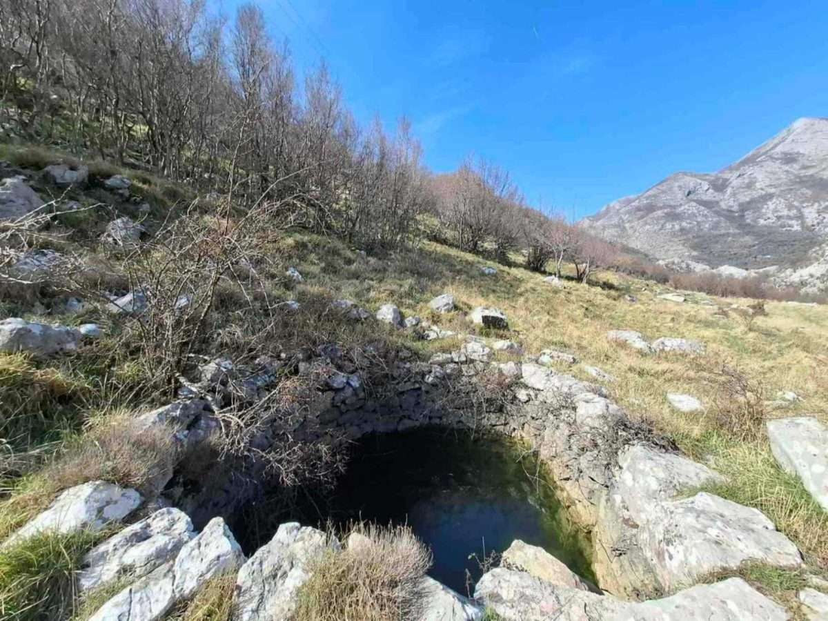 Krenusmo strmom stazom na kojoj je evidentan uticaj atmosferskih padavina, sipara i razruđenog kraškog kamena. Na usponu, nakon pesetak metara, nalaze se dva kaptirana izvora, lijepo sačuvana, a pored izvora rastu stara stabla murava. Ispred izvora nalaze se masivna kamena dubljena korita, primjer crnogorske arhitekture, ali i važna pojila za sitnu stoku. Po tragovima na stazi vidi se da se i danas uzgaja sitna stoka. Markacije na samom putu prilično su rijetke i dosta slabe. Sa naše desne strane jedan krak vodi ka Docima i ka zalažanskim stranama pa je to prvo razdvajanje staze. Važno je napomenuti da na svim ovim stazama bude sa vama neko ko ima bogato iskustvo, jer brojne staze i kanice lako mogu odvesti putnika na manje poznate puteve.