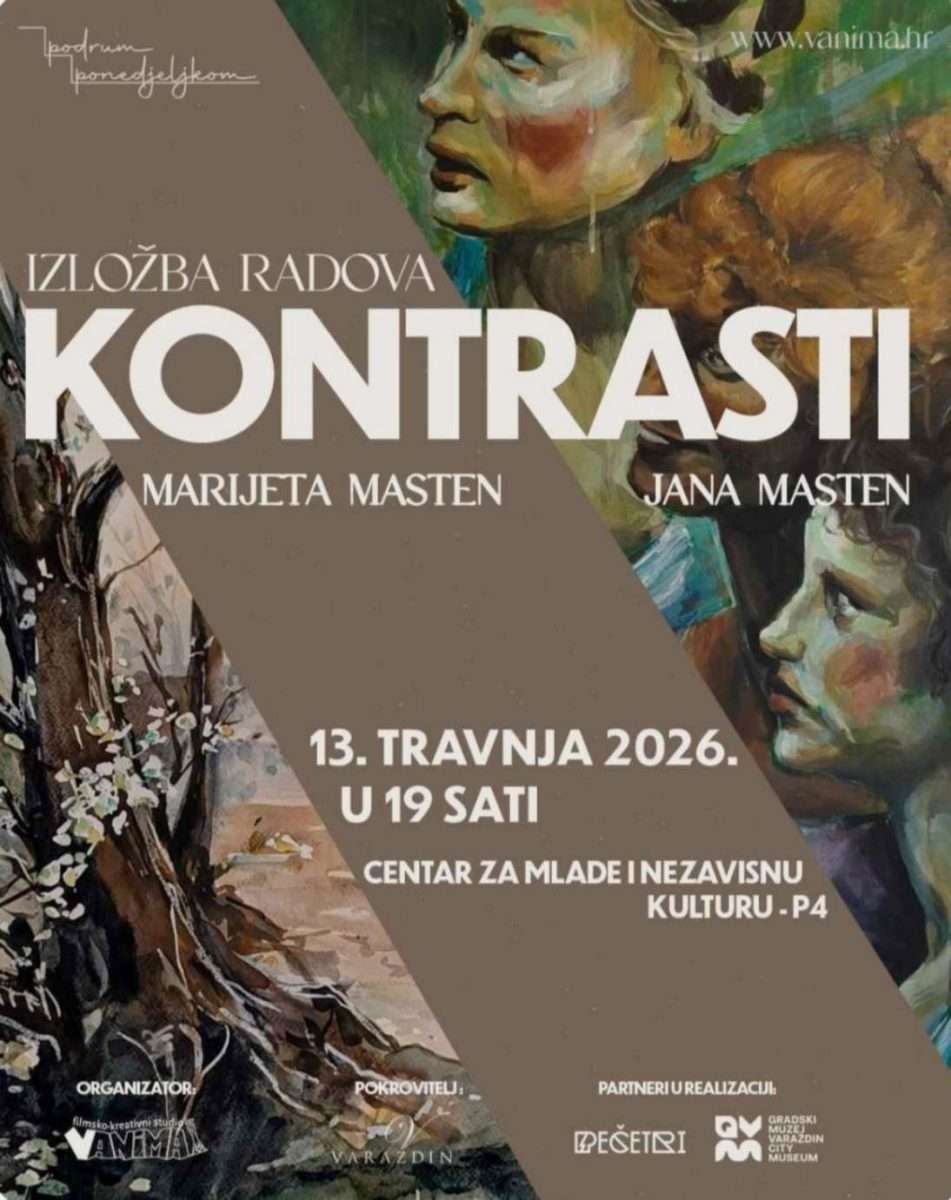 Izložba posebnog značaja naziva KONTRASTI, autorica Marijete Masten i Jane Masten, susreta majke i kćeri, predstavlja petnaestak radova u tehnici akvarela i akrila, čiji se umjetnički izrazi i razilaze i spajaju, nadrastaju pojedinačni senzibilitet umjetnika i kao izrazi prevladavajuće određuju dvostruki korijen stila, otvorena je 13. travnja 2026. godine u P4 – Centru za mlade i nezavisnu kulturu u Varaždinu