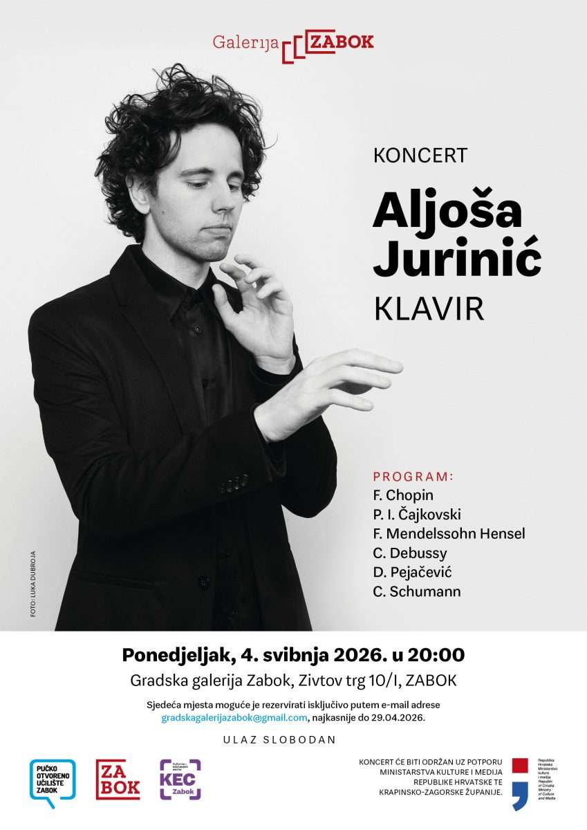 Ulaz na koncert je besplatan, ali je broj sjedećih mjesta u Galeriji ograničen. Ukoliko želite, sjedeća mjesta možete rezervirati isključivo putem e-mail adrese gradskagalerijazabok@gmail.com, najkasnije do 29. travnja 2026.