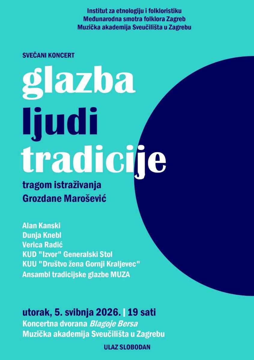 Dio programa je i svečani koncert Glazba, ljudi, tradicije: tragom istraživanja Grozdane Marošević, koji će se održati u utorak, 5. svibnja u 19 sati u Koncertnoj dvorano Blagoje Bersa na Muzičkoj akademiji Sveučilišta u Zagrebu.