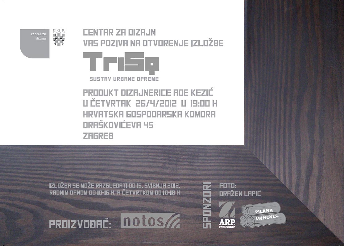 Centar za dizajn, Hrvatska gospodarska komora, Draškovićeva 45, Zagreb Ada Kezić TriSq sustav urbane opreme od 26. 04. (u 19 sati) do 15. 05. 2012. Izložbom se predstavlja novi projekt dizajnerice Ade Kezić TriSq sustav urbane opreme… Read More »Ada Kezić: TriSq sustav urbane opreme