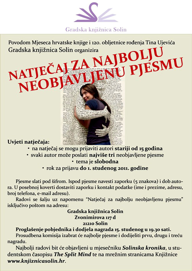 Povodom Mjeseca hrvatske knjige i 120 godina rođenja Tina Ujevića Gradska knjižnica Solin objavljuje natječaj za najbolju neobjavljenu pjesmu